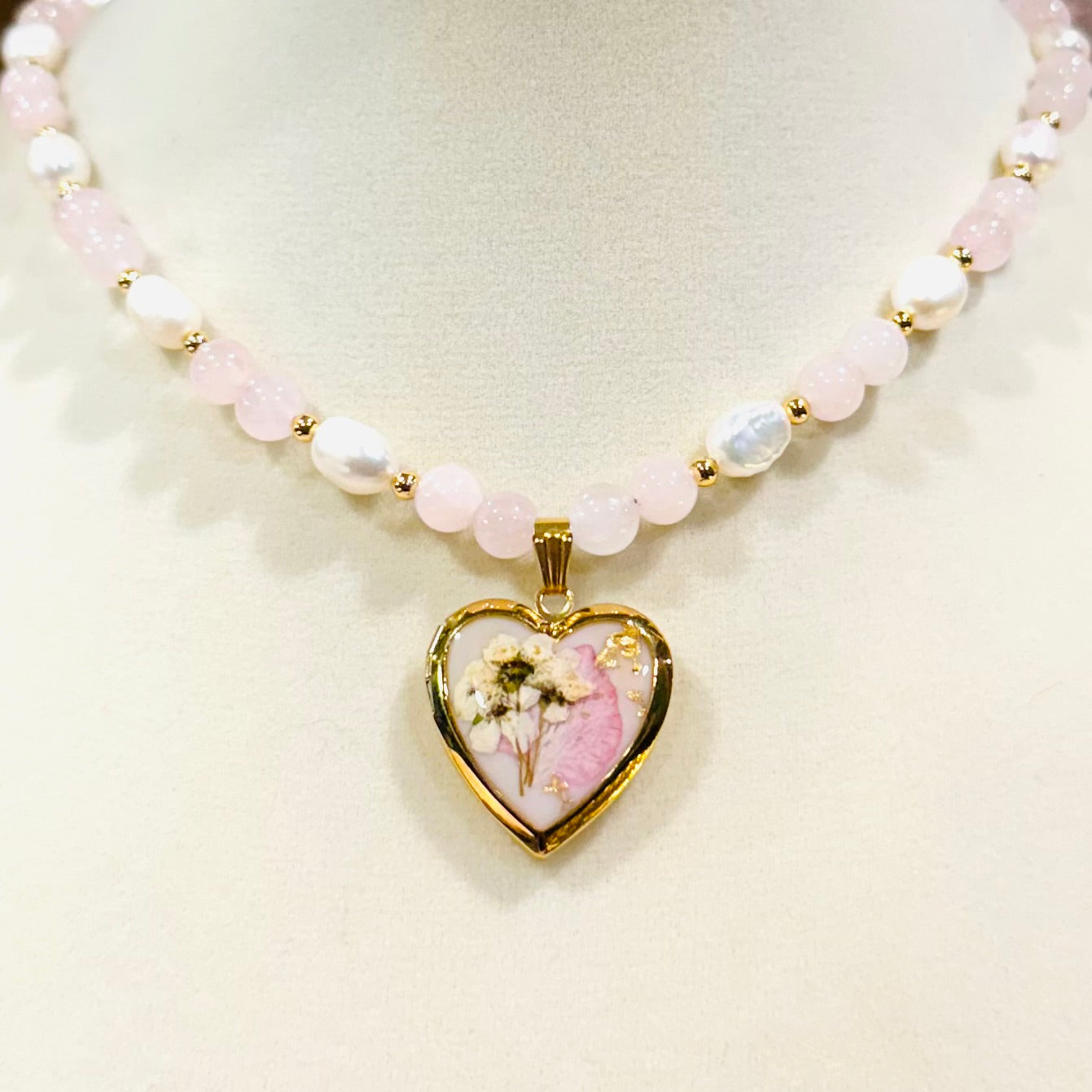 this piece contains real dried flowers , created with love and magic. gold heart-shaped locket. genuine freshwater pearls and rose quartz crystals. please keep in mind that these are all handmade using real flowers. colors and flower size/shape can vary from piece to piece. each piece is unique, no two will be exactly the same, only very very similar 🫶🏽