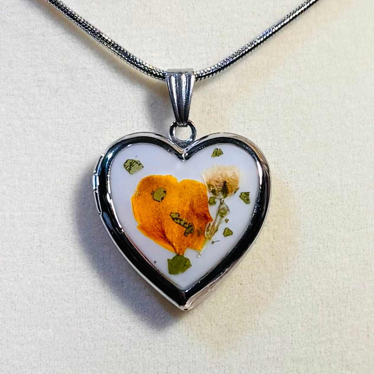 this piece contains real dried flowers , created with love and magic. silver heart-shaped locket. please keep in mind that these are all handmade using real flowers. colors and flower size/shape can vary from piece to piece. each piece is unique, no two will be exactly the same, only very very similar 🫶🏽