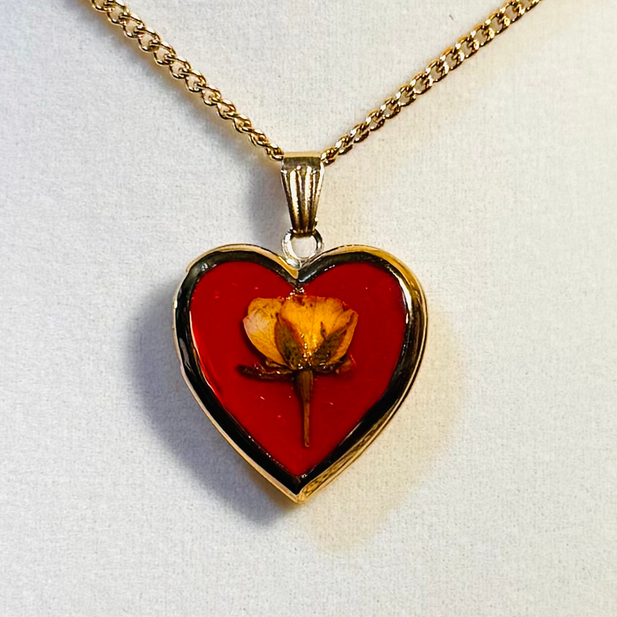 this piece contains real dried flowers , created with love and magic. gold heart-shaped locket. please keep in mind that these are all handmade using real flowers. colors and flower size/shape can vary from piece to piece. each piece is unique, no two will be exactly the same, only very very similar 🫶🏽
