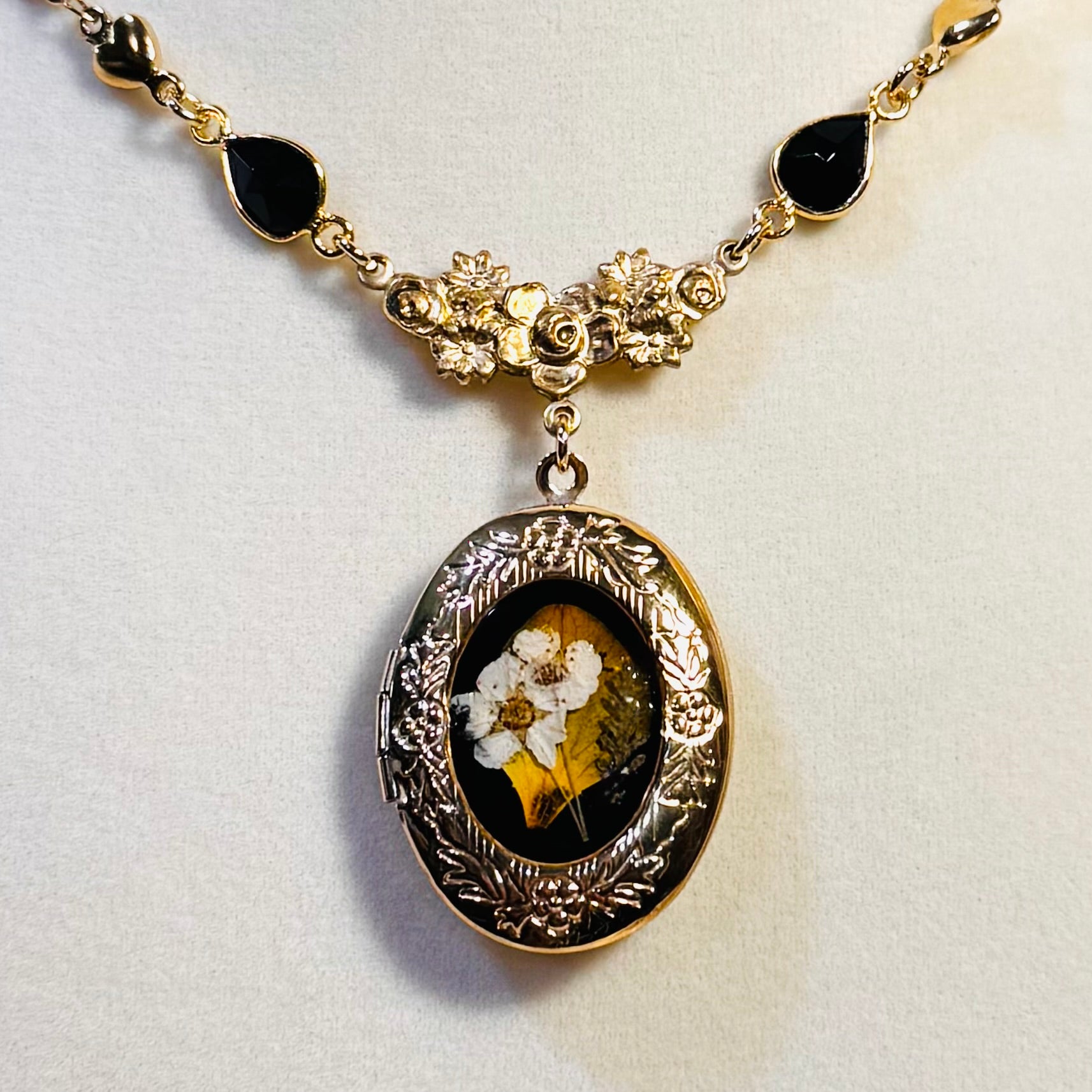 this piece contains real dried flowers , created with love and magic. gold oval-shaped locket. black glass charms. please keep in mind that these are all handmade using real flowers. colors and flower size/shape can vary from piece to piece. each piece is unique, no two will be exactly the same, only very very similar 🫶🏽