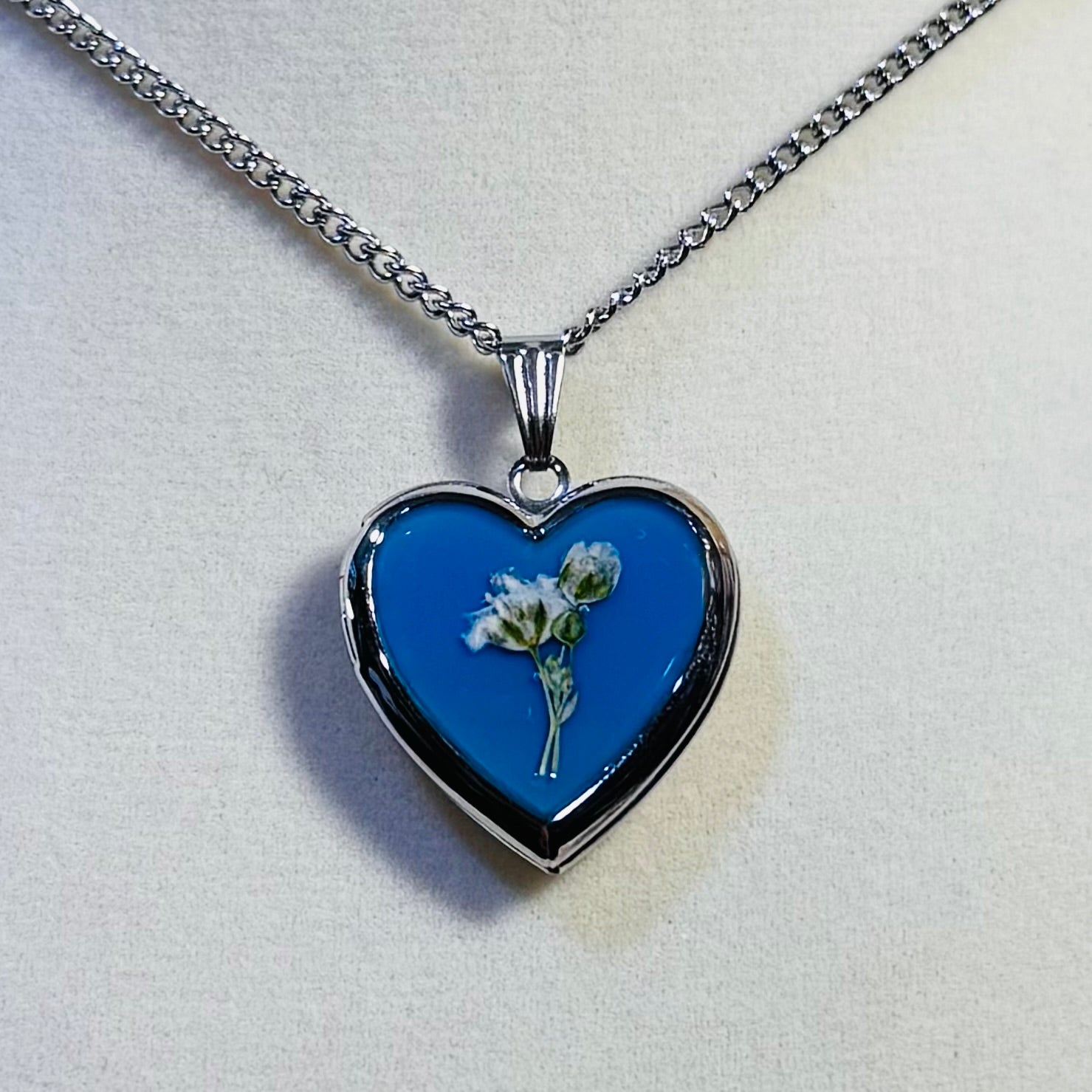 this piece contains real dried flowers , created with love and magic. silver heart-shaped locket. please keep in mind that these are all handmade using real flowers. colors and flower size/shape can vary from piece to piece. each piece is unique, no two will be exactly the same, only very very similar 🫶🏽