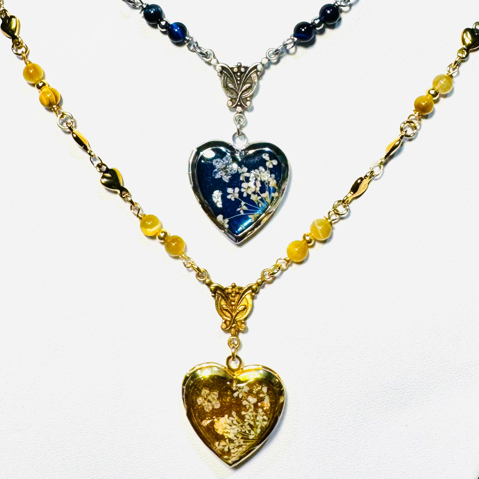 these pieces contain real dried flowers , created with love and magic. silver and gold heart-shaped lockets. SOLD AS A SET. individual lockets are also available.