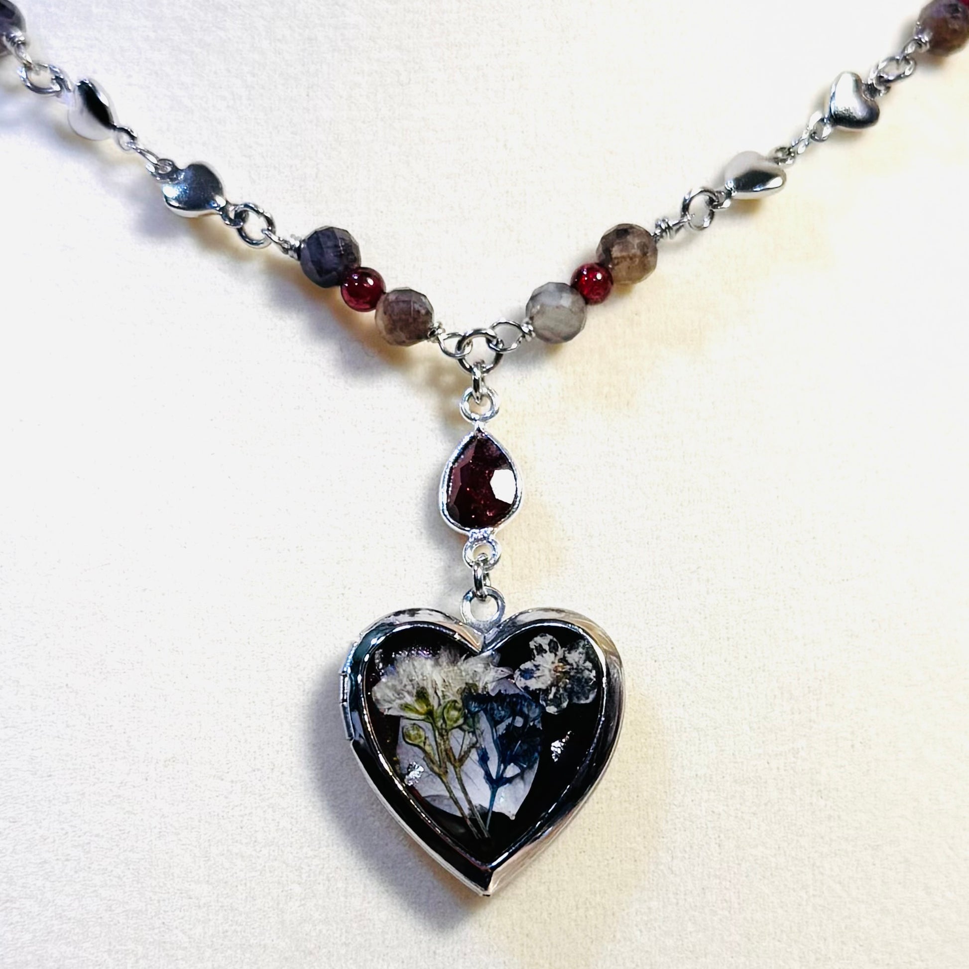 this piece contains real dried flowers , created with love and magic. silver heart-shaped locket. genuine crystals. please keep in mind that these are all handmade using real flowers. colors and flower size/shape can vary from piece to piece. each piece is unique, no two will be exactly the same, only very very similar 🫶🏽
