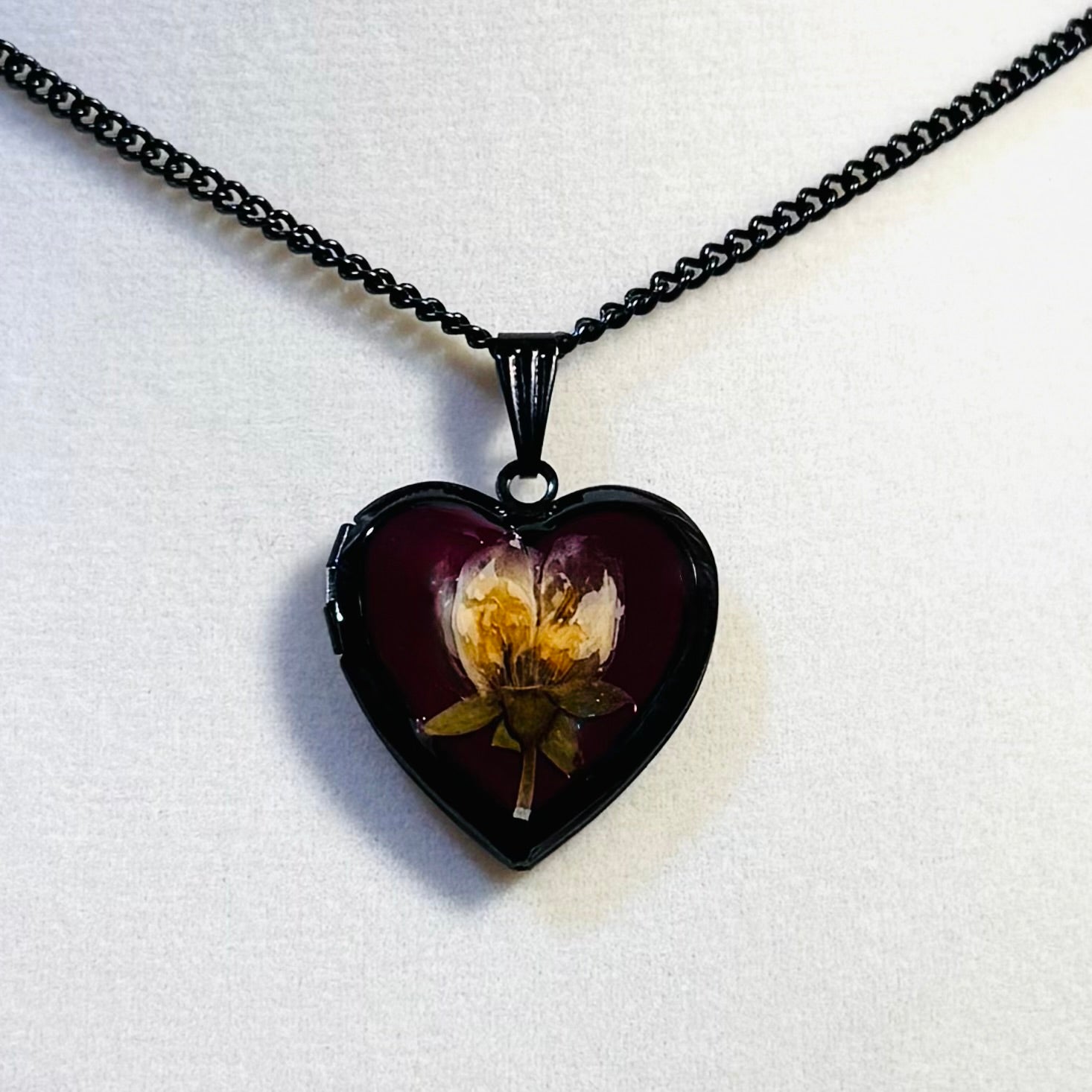 this piece contains real dried flowers , created with love and magic. black heart-shaped locket. please keep in mind that these are all handmade using real flowers. colors and flower size/shape can vary from piece to piece. each piece is unique, no two will be exactly the same, only very very similar 🫶🏽