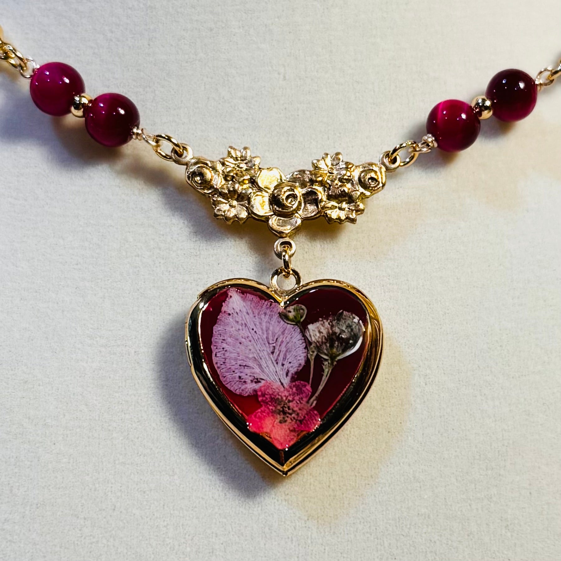 this piece contains real dried flowers , created with love and magic. gold heart-shaped locket. genuine crystals. please keep in mind that these are all handmade using real flowers. colors and flower size/shape can vary from piece to piece. each piece is unique, no two will be exactly the same, only very very similar 🫶🏽