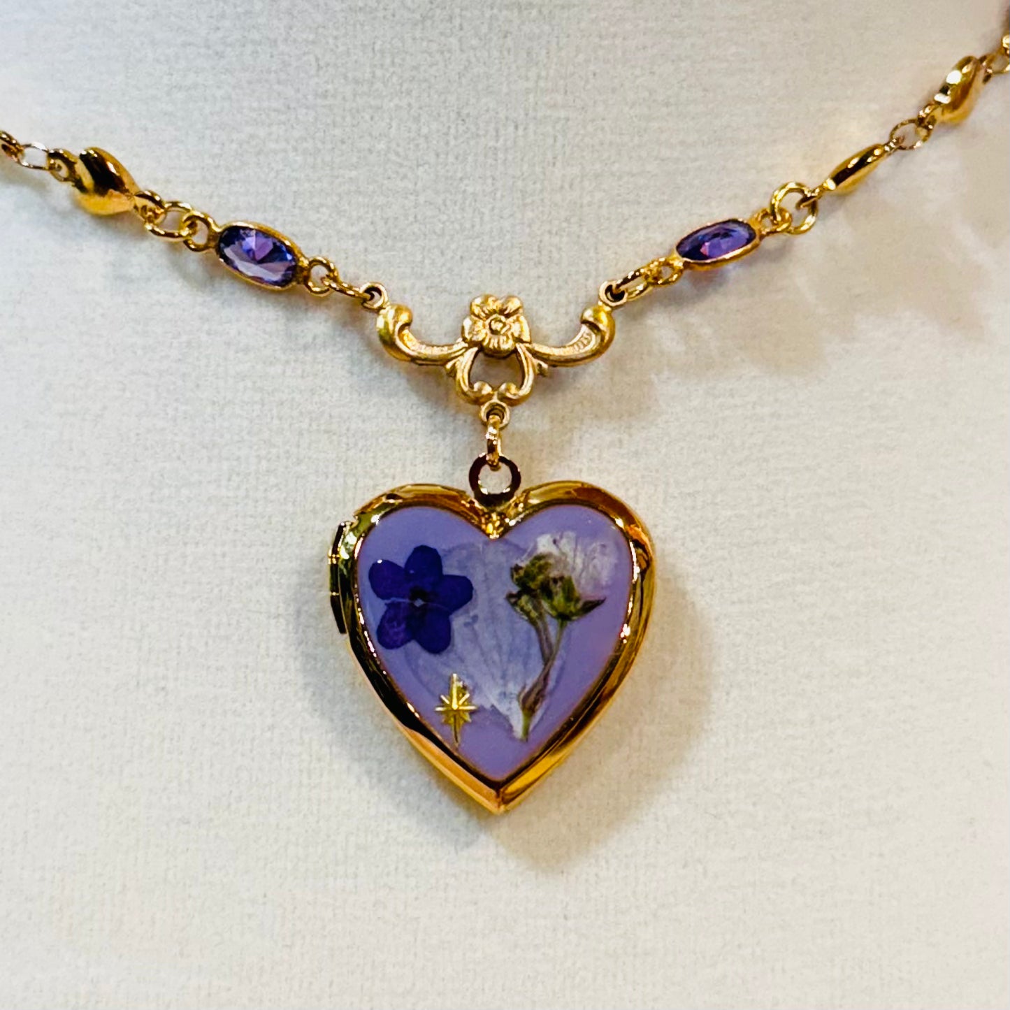 this piece contains real dried flowers , created with love and magic. gold heart-shaped locket. purple glass cahrms. please keep in mind that these are all handmade using real flowers. colors and flower size/shape can vary from piece to piece. each piece is unique, no two will be exactly the same, only very very similar 🫶🏽