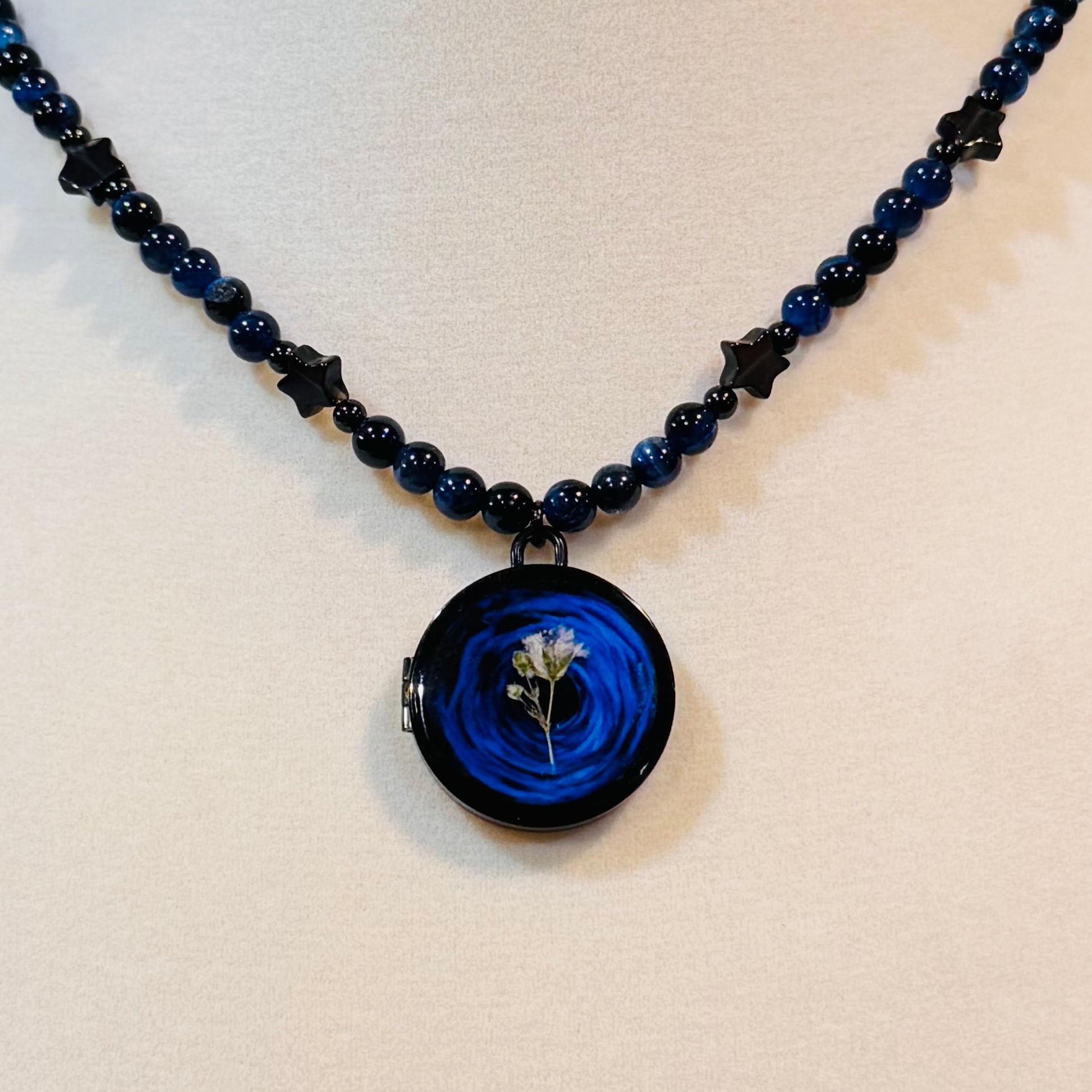 this piece contains real dried flowers , created with love and magic. black circle-shaped locket. genuine crystals. please keep in mind that these are all handmade using real flowers. colors and flower size/shape can vary from piece to piece. each piece is unique, no two will be exactly the same, only very very similar 🫶🏽