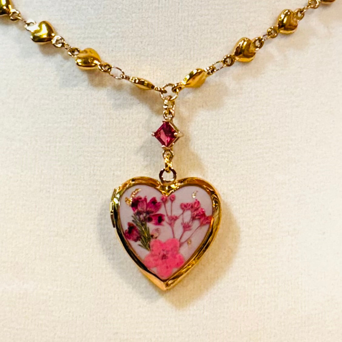 this piece contains real dried flowers , created with love and magic. gold heart-shaped locket. pink glass charm. please keep in mind that these are all handmade using real flowers. colors and flower size/shape can vary from piece to piece. each piece is unique, no two will be exactly the same, only very very similar 🫶🏽