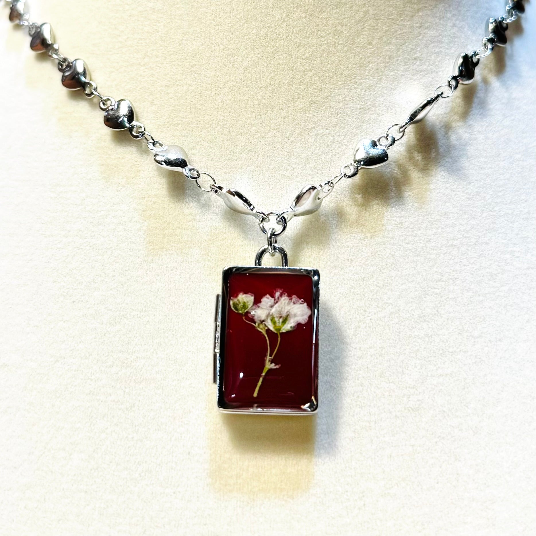 this piece contains real dried flowers , created with love and magic. silver rectangle-shaped locket. please keep in mind that these are all handmade using real flowers. colors and flower size/shape can vary from piece to piece. each piece is unique, no two will be exactly the same, only very very similar