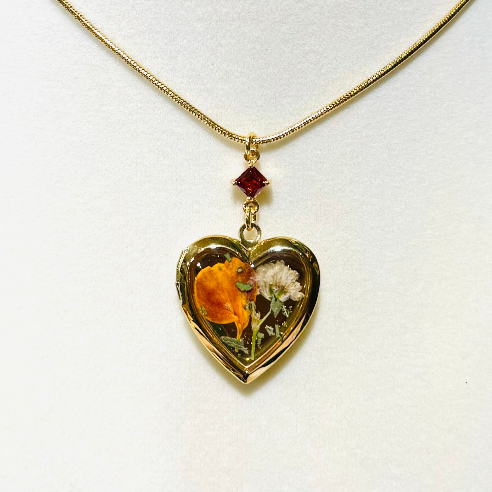 this piece contains real dried flowers , created with love and magic. gold heart-shaped locket with orange glass charms.