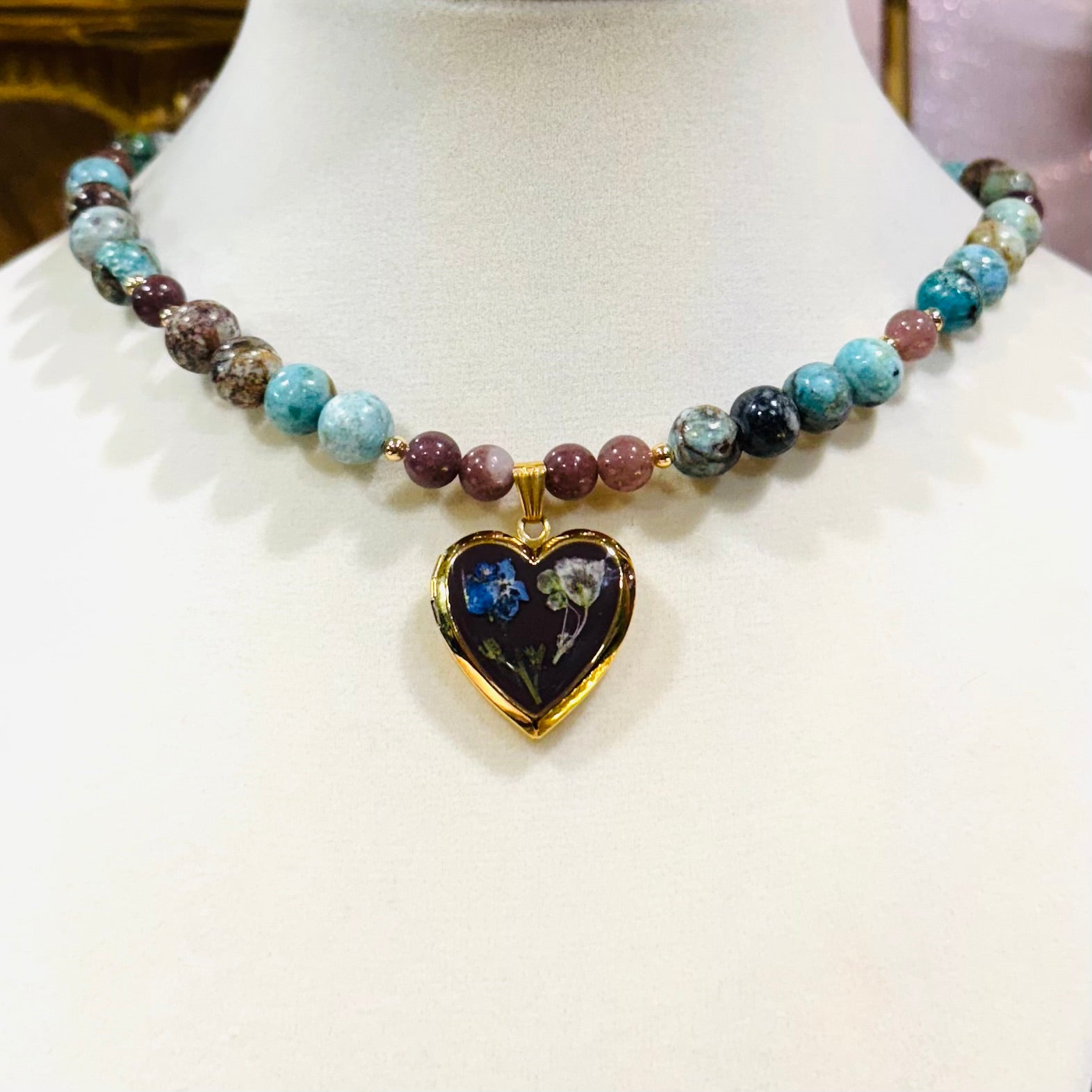 this piece contains real dried flowers , created with love and magic. gold heart-shaped locket. genuine crystals. please keep in mind that these are all handmade using real flowers. colors and flower size/shape can vary from piece to piece. each piece is unique, no two will be exactly the same, only very very similar 🫶🏽
