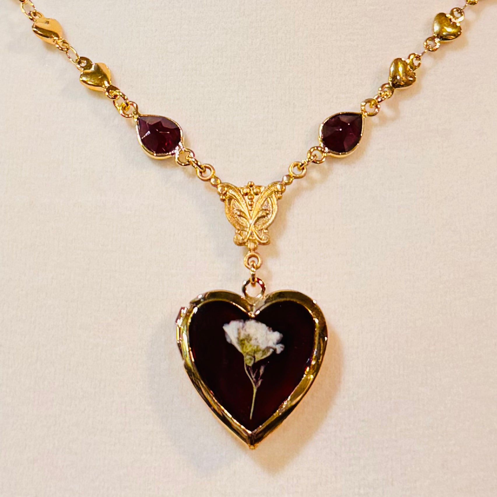 this piece contains real dried flowers , created with love and magic. gold heart-shaped locket. please keep in mind that these are all handmade using real flowers. colors and flower size/shape can vary from piece to piece. each piece is unique, no two will be exactly the same, only very very similar 🫶🏽