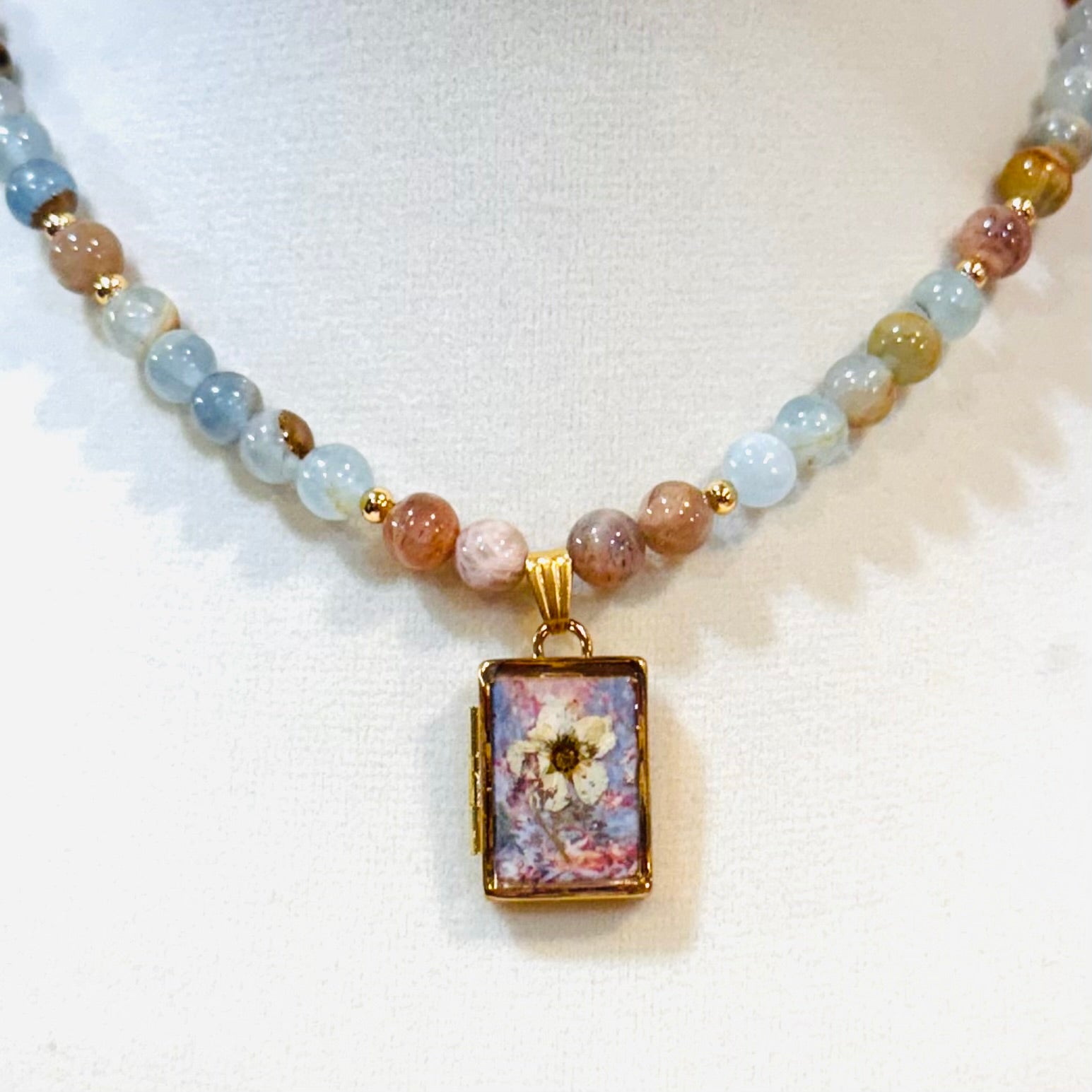 this piece contains real dried flowers , created with love and magic. gold rectangle-shaped locket. genuine crystals. please keep in mind that these are all handmade using real flowers. colors and flower size/shape can vary from piece to piece. each piece is unique, no two will be exactly the same, only very very similar 🫶🏽