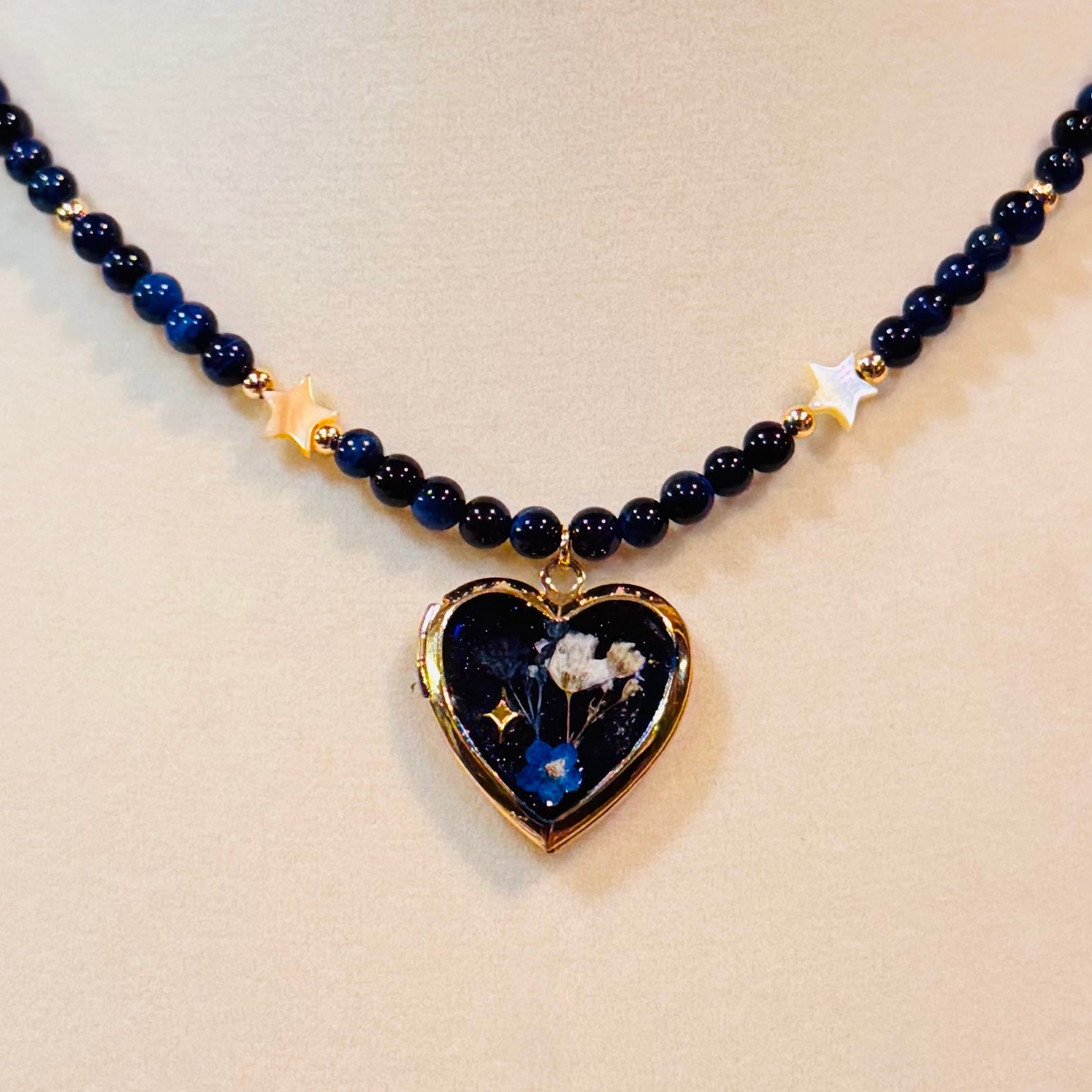 this piece contains real dried flowers , created with love and magic. gold heart-shaped locket. genuine crystals. please keep in mind that these are all handmade using real flowers. colors and flower size/shape can vary from piece to piece. each piece is unique, no two will be exactly the same, only very very similar 🫶🏽