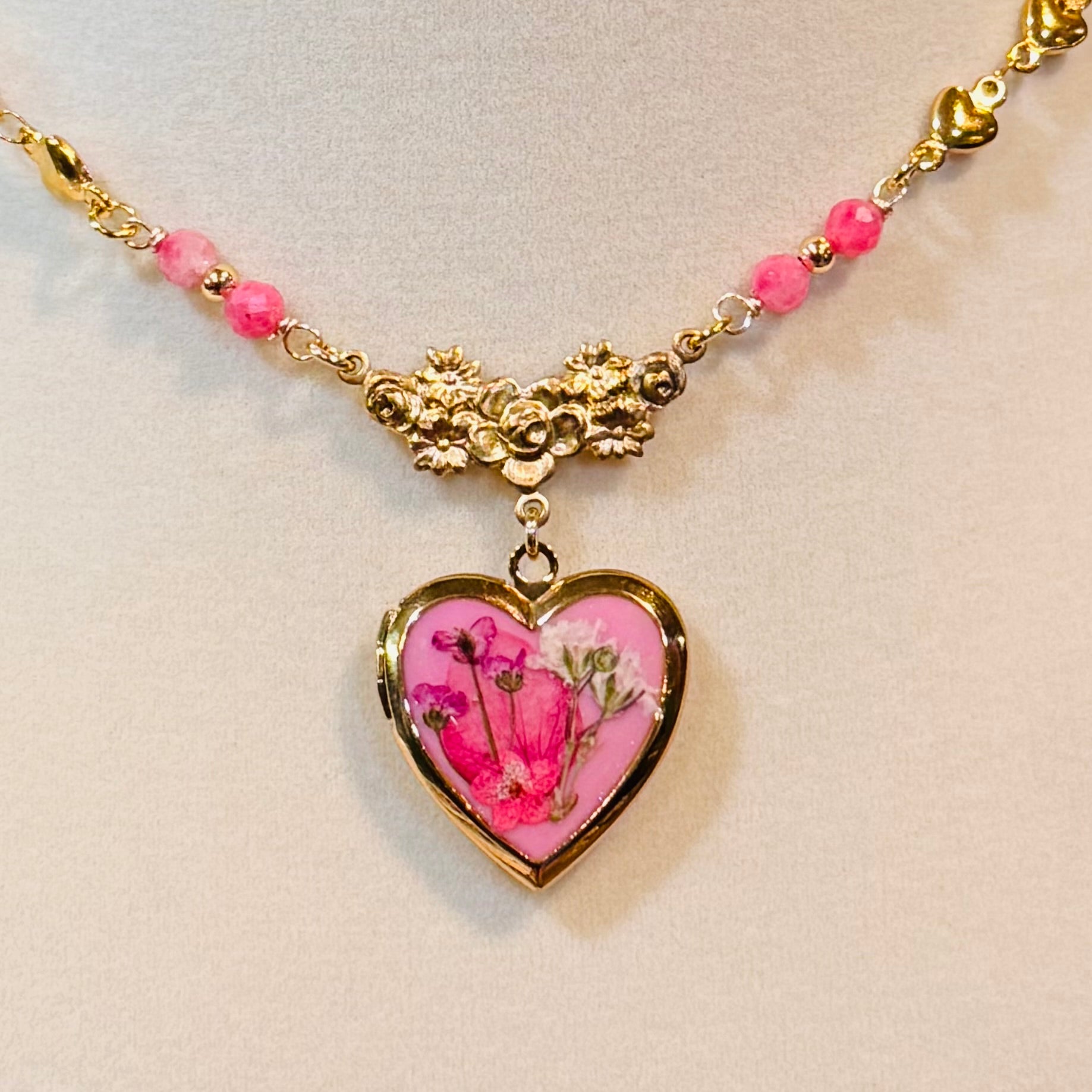 this piece contains real dried flowers , created with love and magic. gold heart-shaped locket. genuine crystals. please keep in mind that these are all handmade using real flowers. colors and flower size/shape can vary from piece to piece. each piece is unique, no two will be exactly the same, only very very similar 🫶🏽