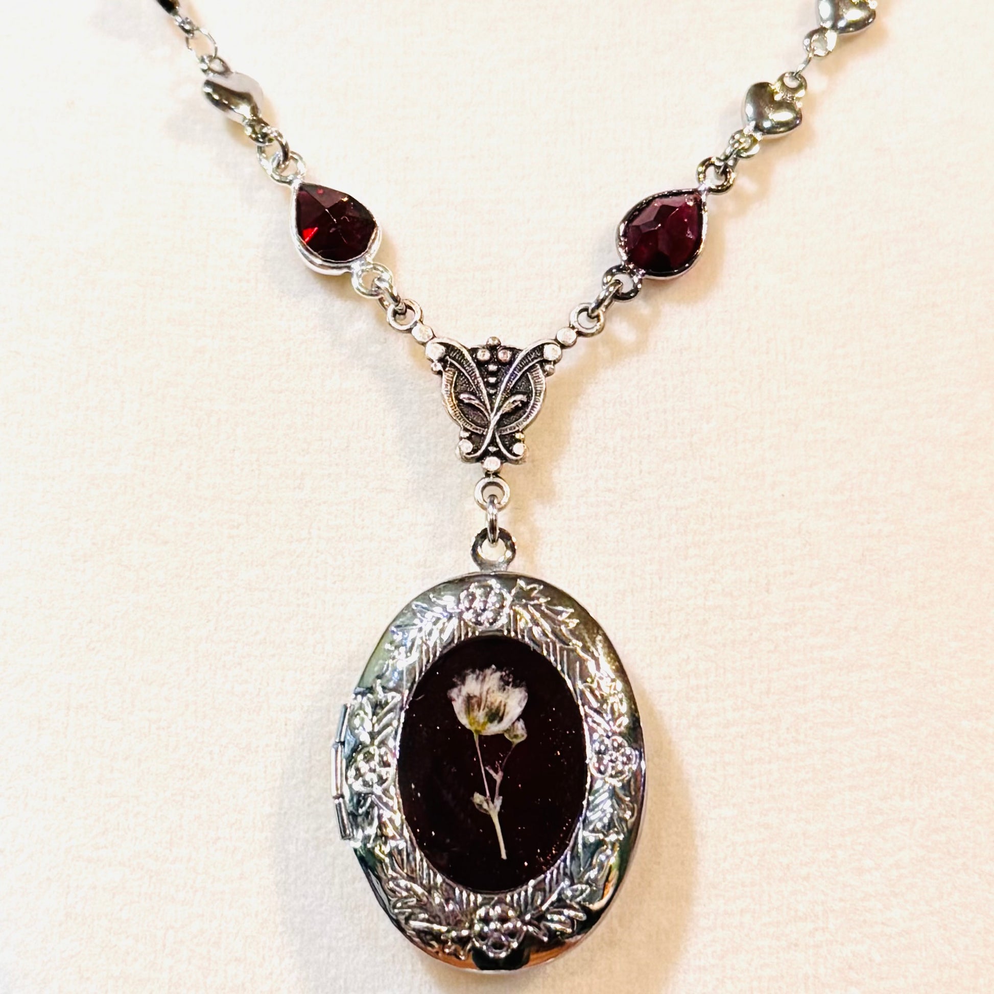 this piece contains real dried flowers , created with love and magic. silver oval-shaped locket glass charms. please keep in mind that these are all handmade using real flowers. colors and flower size/shape can vary from piece to piece. each piece is unique, no two will be exactly the same, only very very similar 🫶🏽