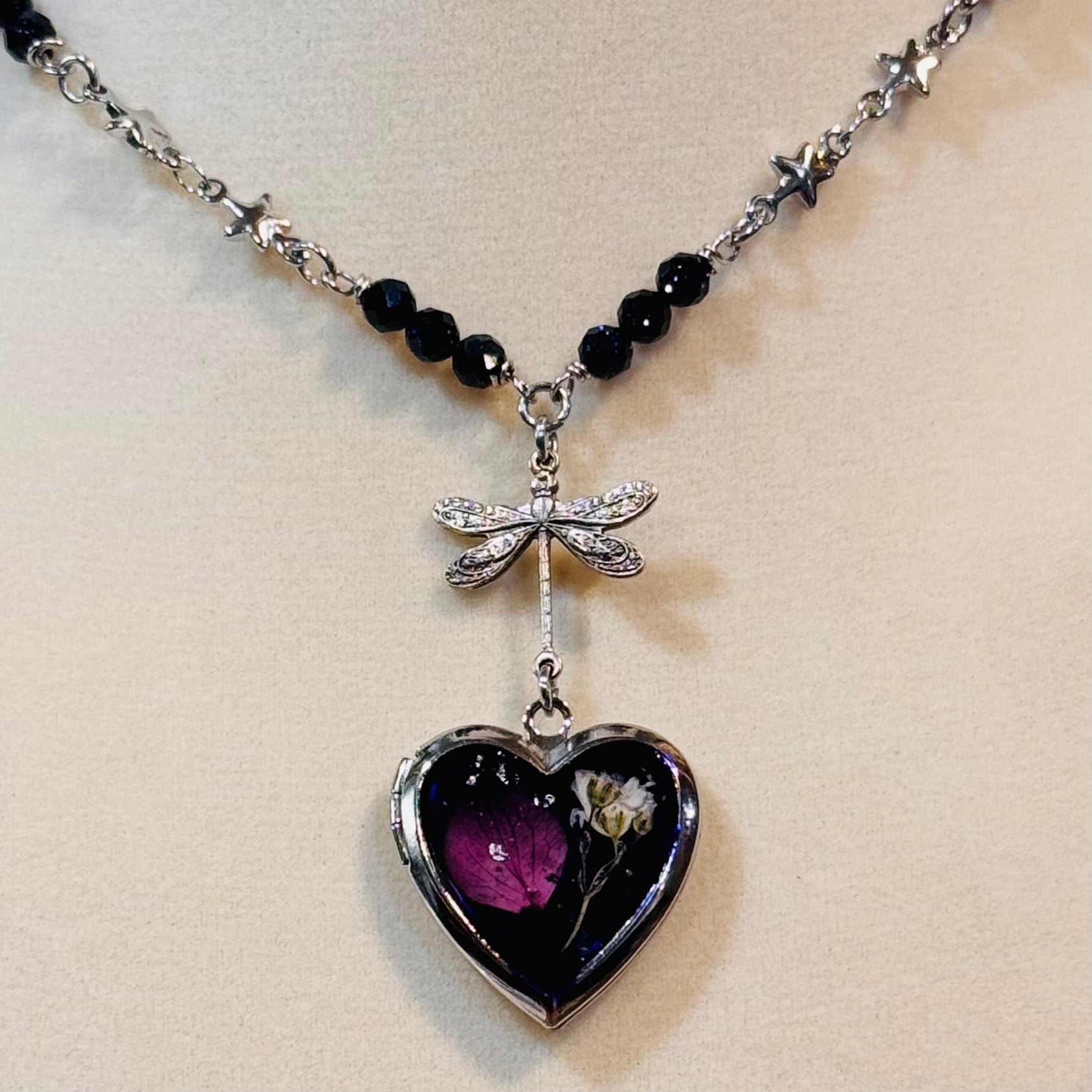 this piece contains real dried flowers , created with love and magic. silver heart-shaped locket. genuine crystals. please keep in mind that these are all handmade using real flowers. colors and flower size/shape can vary from piece to piece. each piece is unique, no two will be exactly the same, only very very similar 🫶🏽