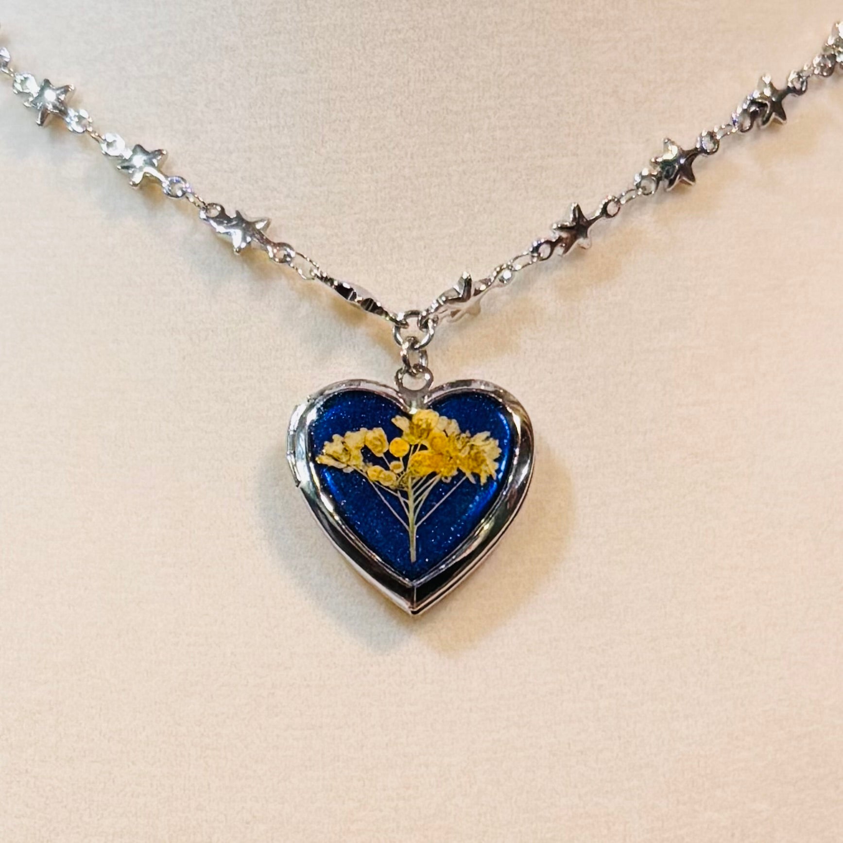 this piece contains real dried flowers , created with love and magic. silver heart-shaped locket. please keep in mind that these are all handmade using real flowers. colors and flower size/shape can vary from piece to piece. each piece is unique, no two will be exactly the same, only very very similar 🫶🏽