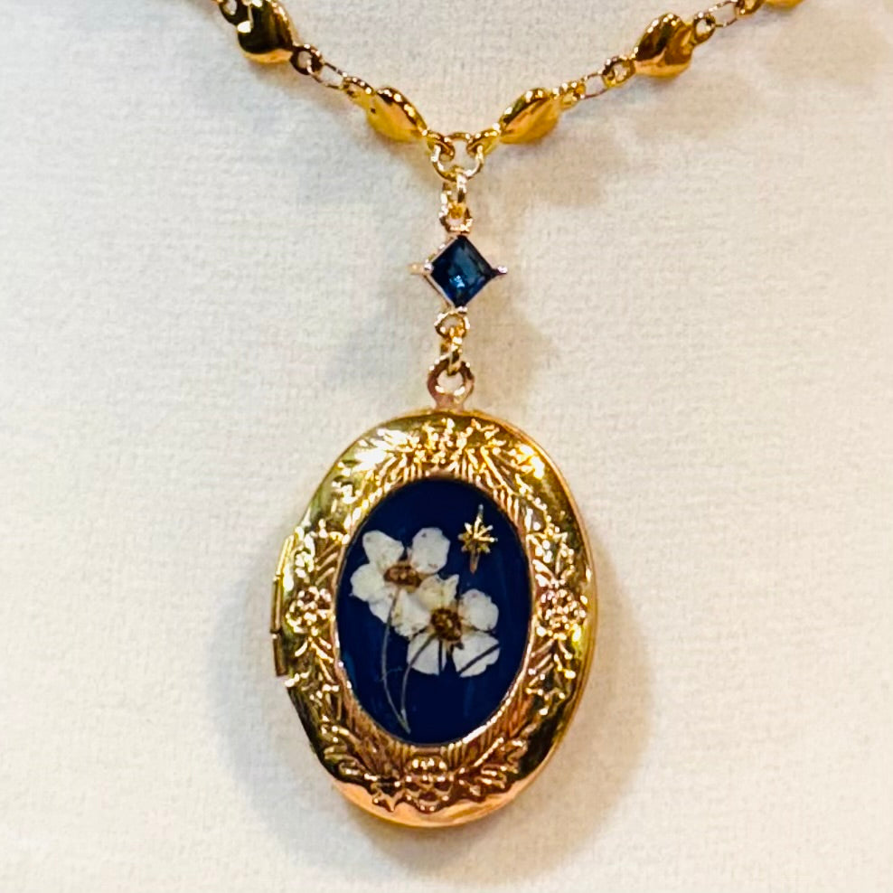 this piece contains real dried flowers , created with love and magic. gold oval-shaped locket. blue glass charm. please keep in mind that these are all handmade using real flowers. colors and flower size/shape can vary from piece to piece. each piece is unique, no two will be exactly the same, only very very similar 🫶🏽
