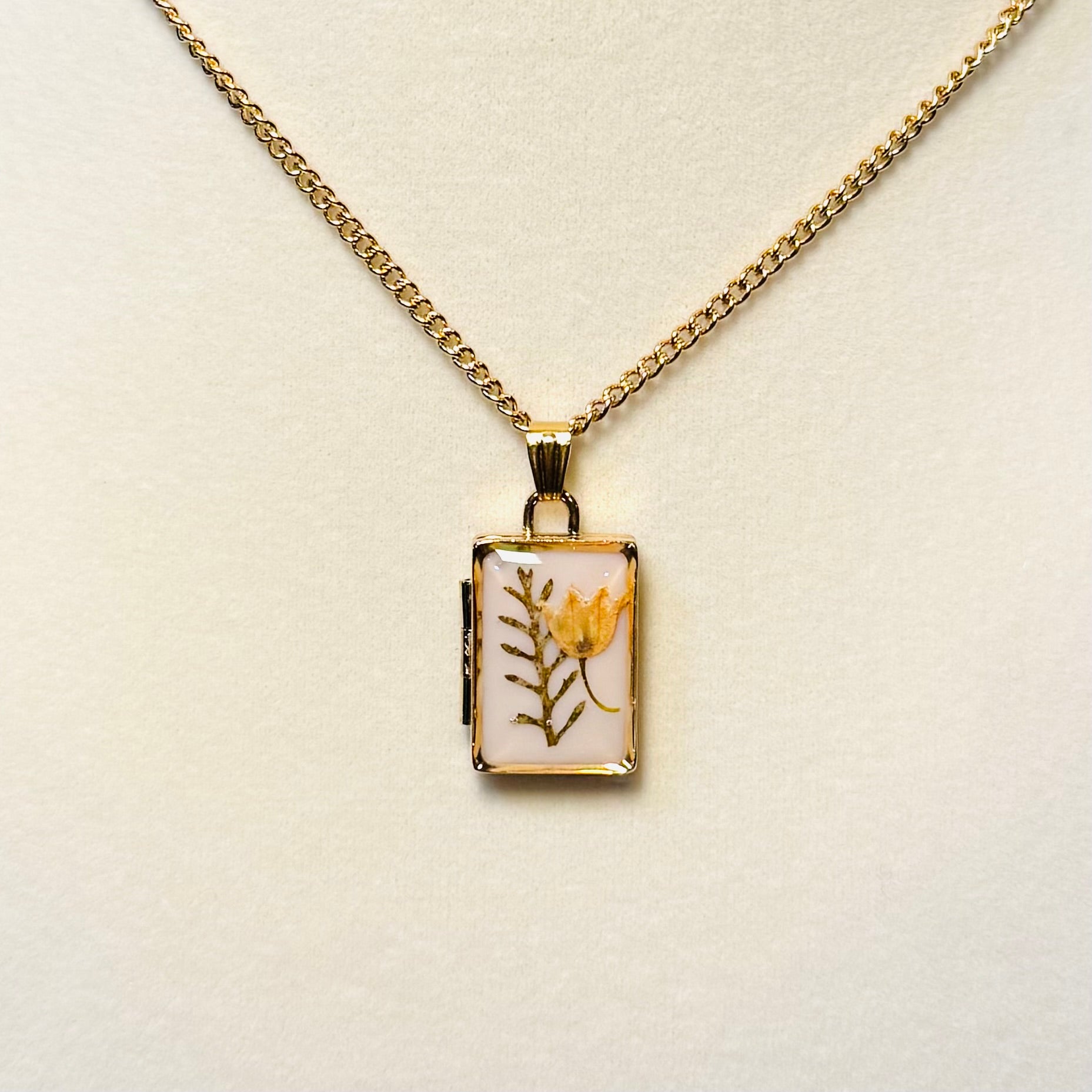 this piece contains real dried flowers , created with love and magic. gold rectangle-shaped locket. please keep in mind that these are all handmade using real flowers. colors and flower size/shape can vary from piece to piece. each piece is unique, no two will be exactly the same, only very very similar 🫶🏽