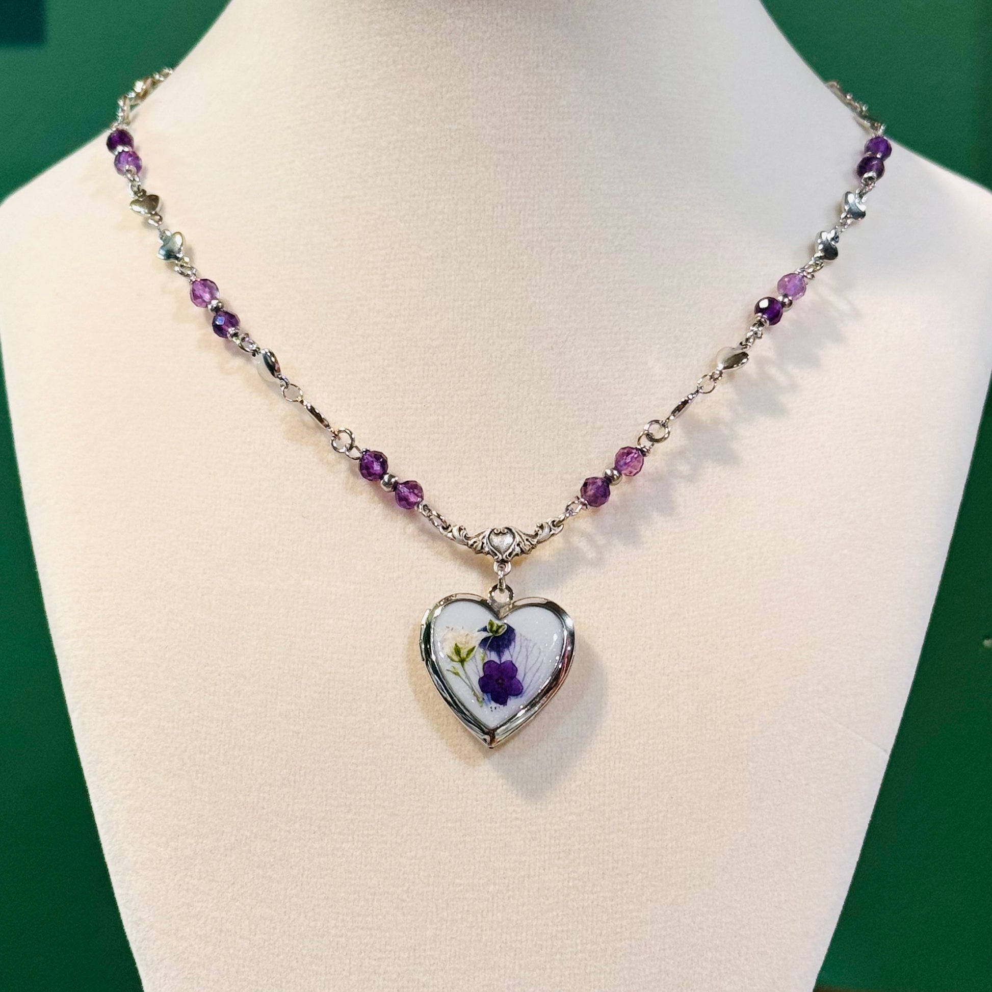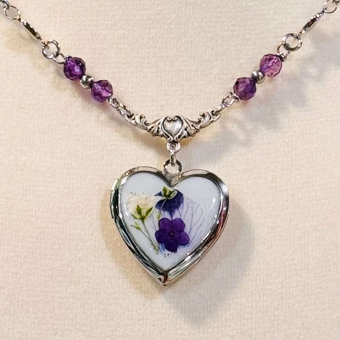 this piece contains real dried flowers , created with love and magic. silver heart-shaped locket. genuine crystal beads. please keep in mind that these are all handmade using real flowers. colors and flower size/shape can vary from piece to piece. each piece is unique, no two will be exactly the same, only very very similar 🫶🏽