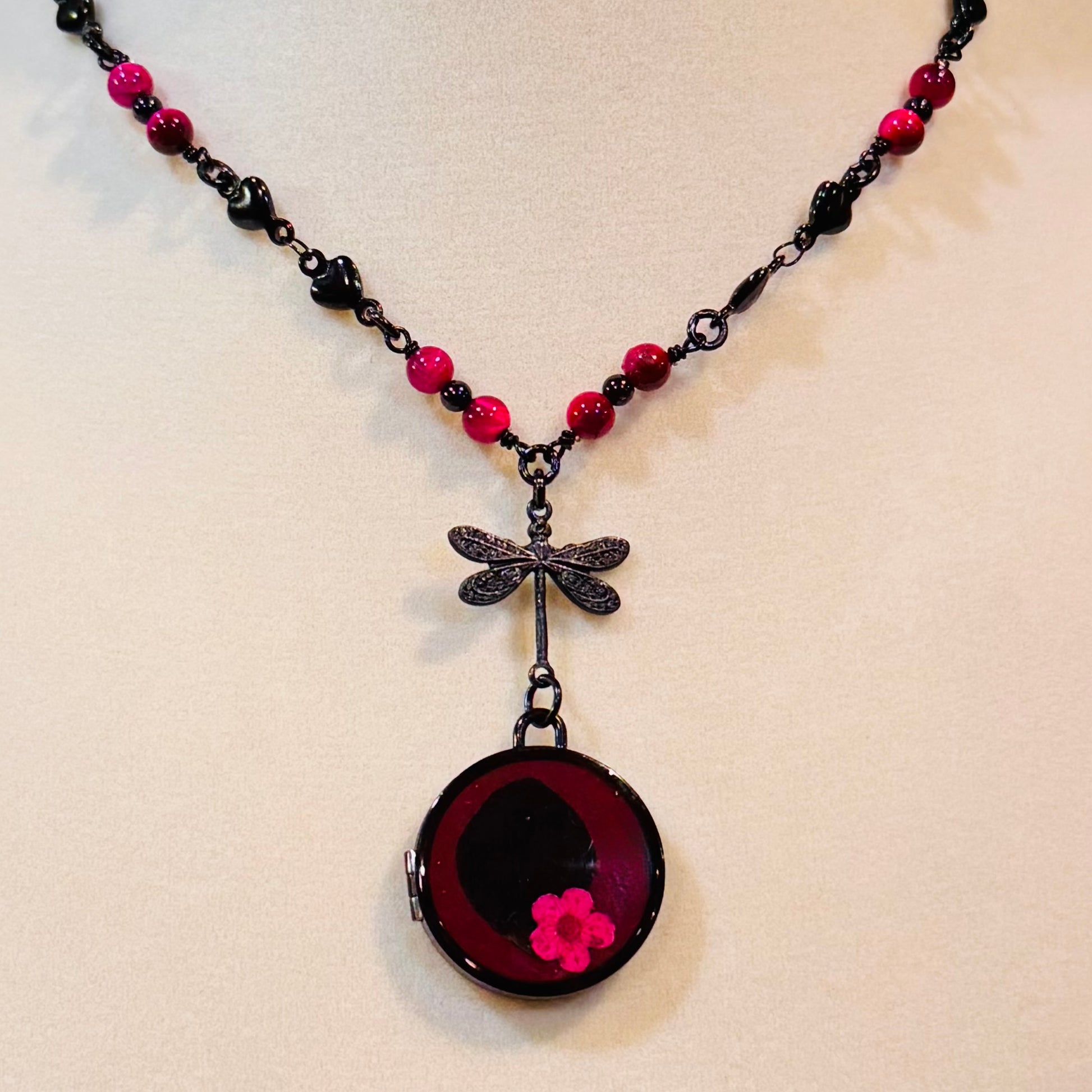 this piece contains real dried flowers , created with love and magic. black circle-shaped locket. genuine crystals. please keep in mind that these are all handmade using real flowers. colors and flower size/shape can vary from piece to piece. each piece is unique, no two will be exactly the same, only very very similar 🫶🏽