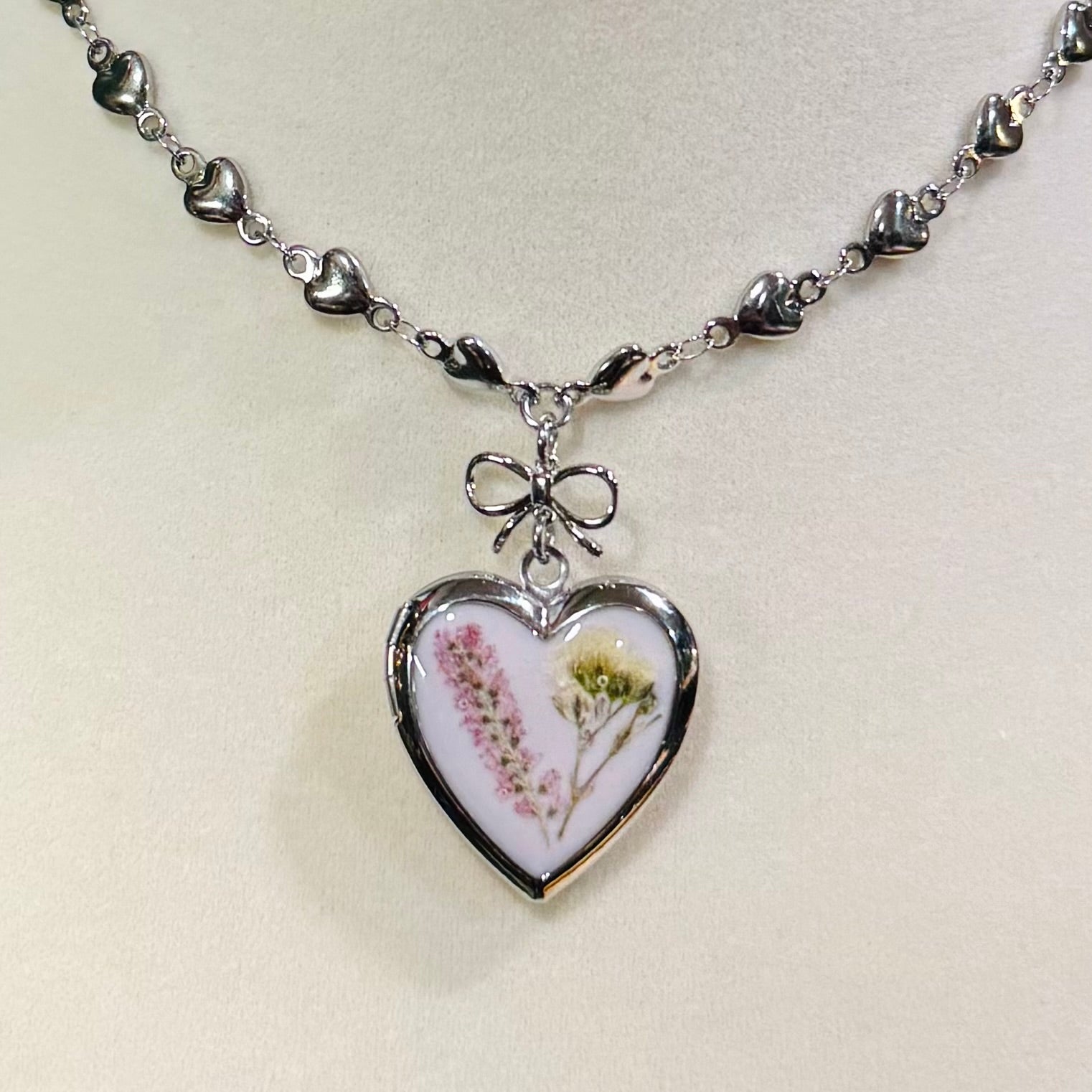 this piece contains real dried flowers , created with love and magic. silver heart-shaped locket. please keep in mind that these are all handmade using real flowers. colors and flower size/shape can vary from piece to piece. each piece is unique, no two will be exactly the same, only very very similar 🫶🏽