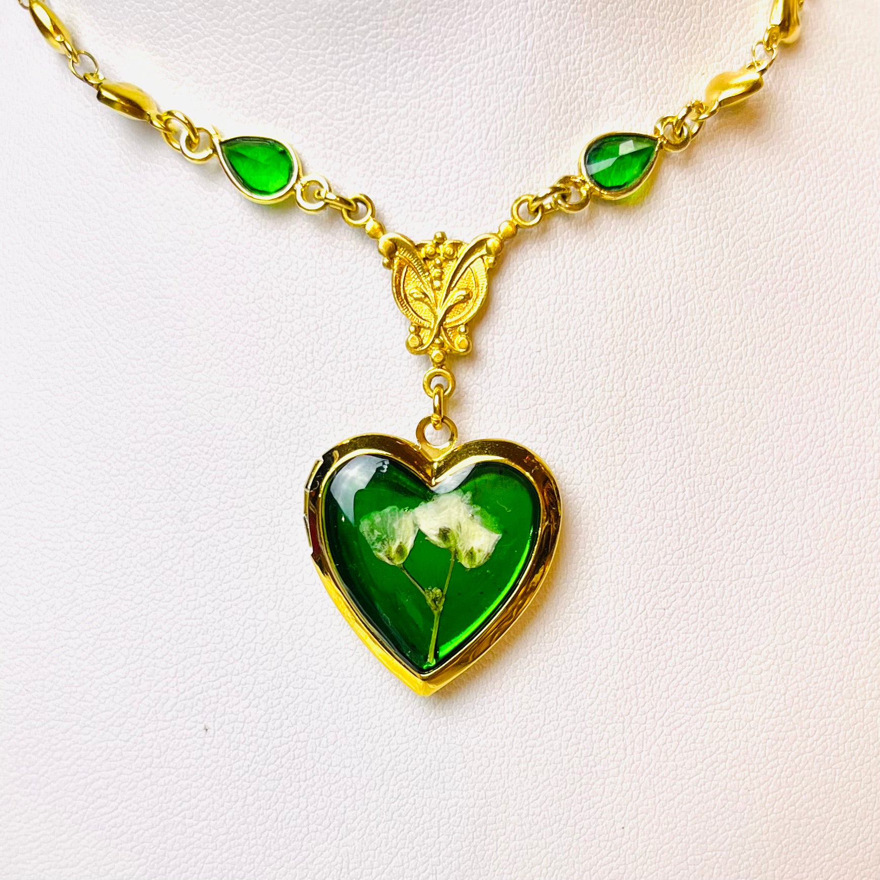this piece contains real dried flowers , created with love and magic. gold heart-shaped locket with green glass charms.