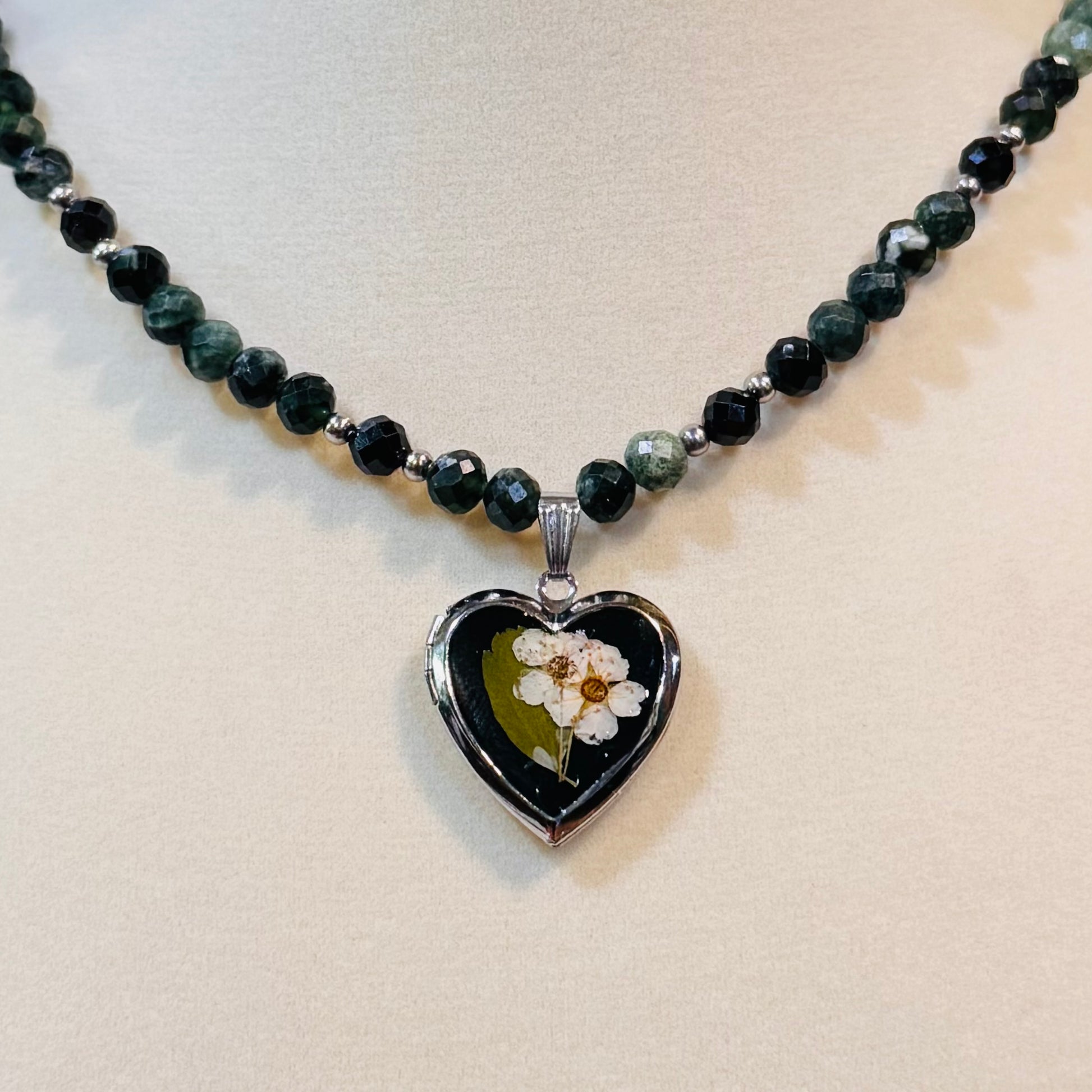 this piece contains real dried flowers , created with love and magic. silver heart-shaped locket. genuine crystals. please keep in mind that these are all handmade using real flowers. colors and flower size/shape can vary from piece to piece. each piece is unique, no two will be exactly the same, only very very similar 🫶🏽