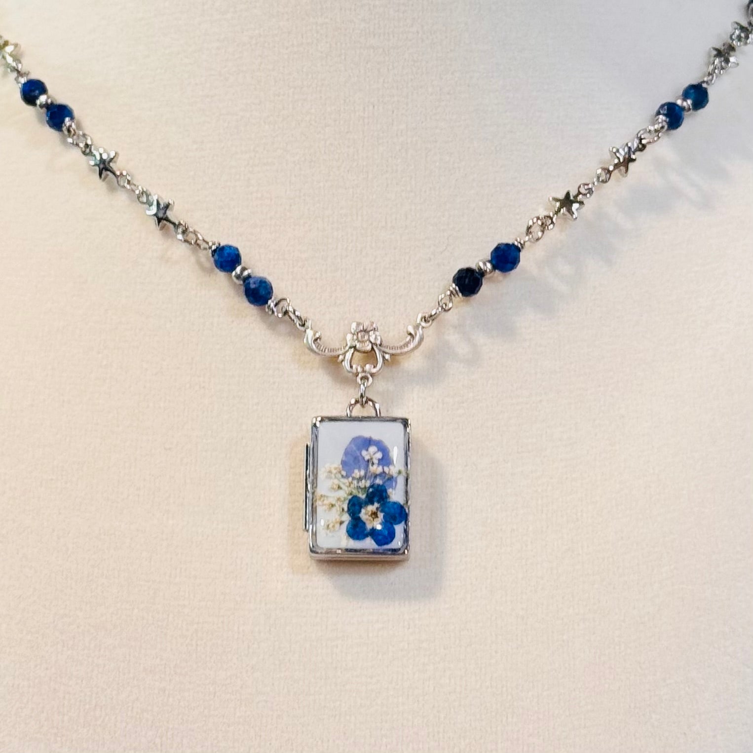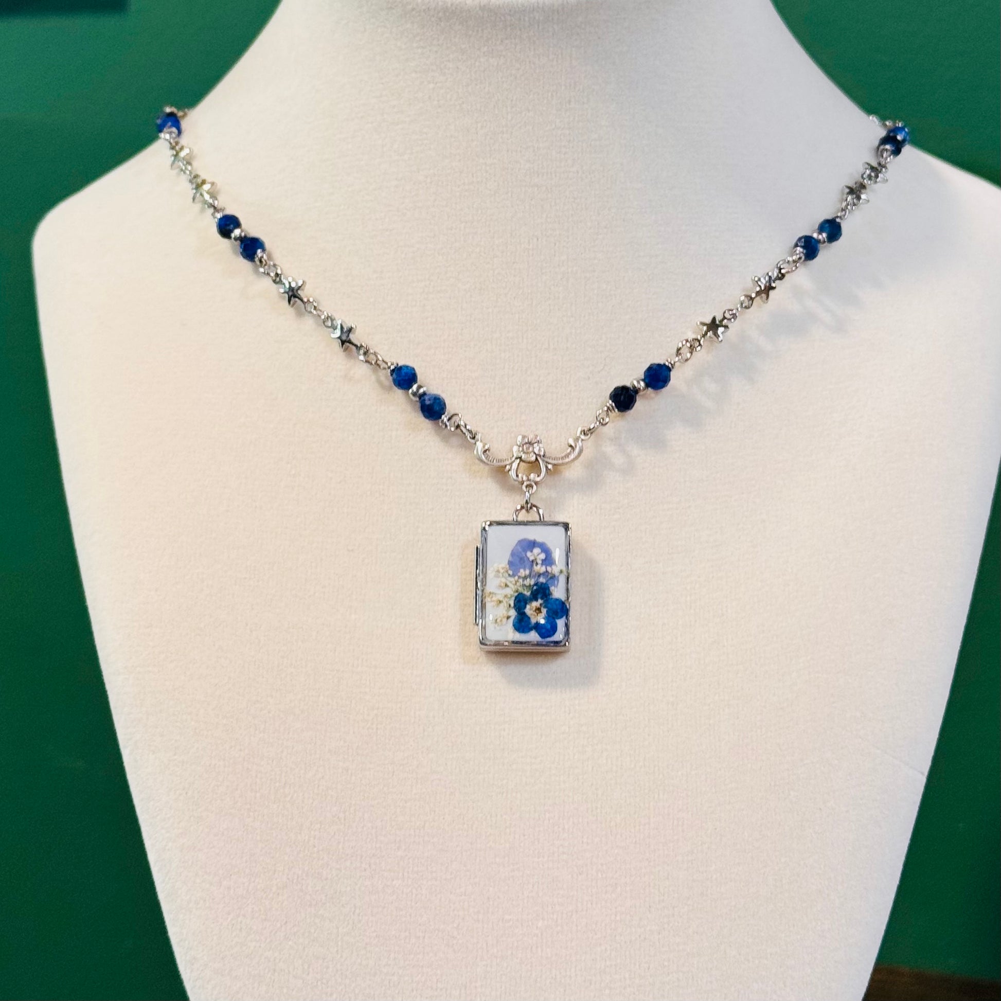 this piece contains real dried flowers , created with love and magic. silver rectangle-shaped locket. genuine crystal beads. please keep in mind that these are all handmade using real flowers. colors and flower size/shape can vary from piece to piece. each piece is unique, no two will be exactly the same, only very very similar 🫶🏽
