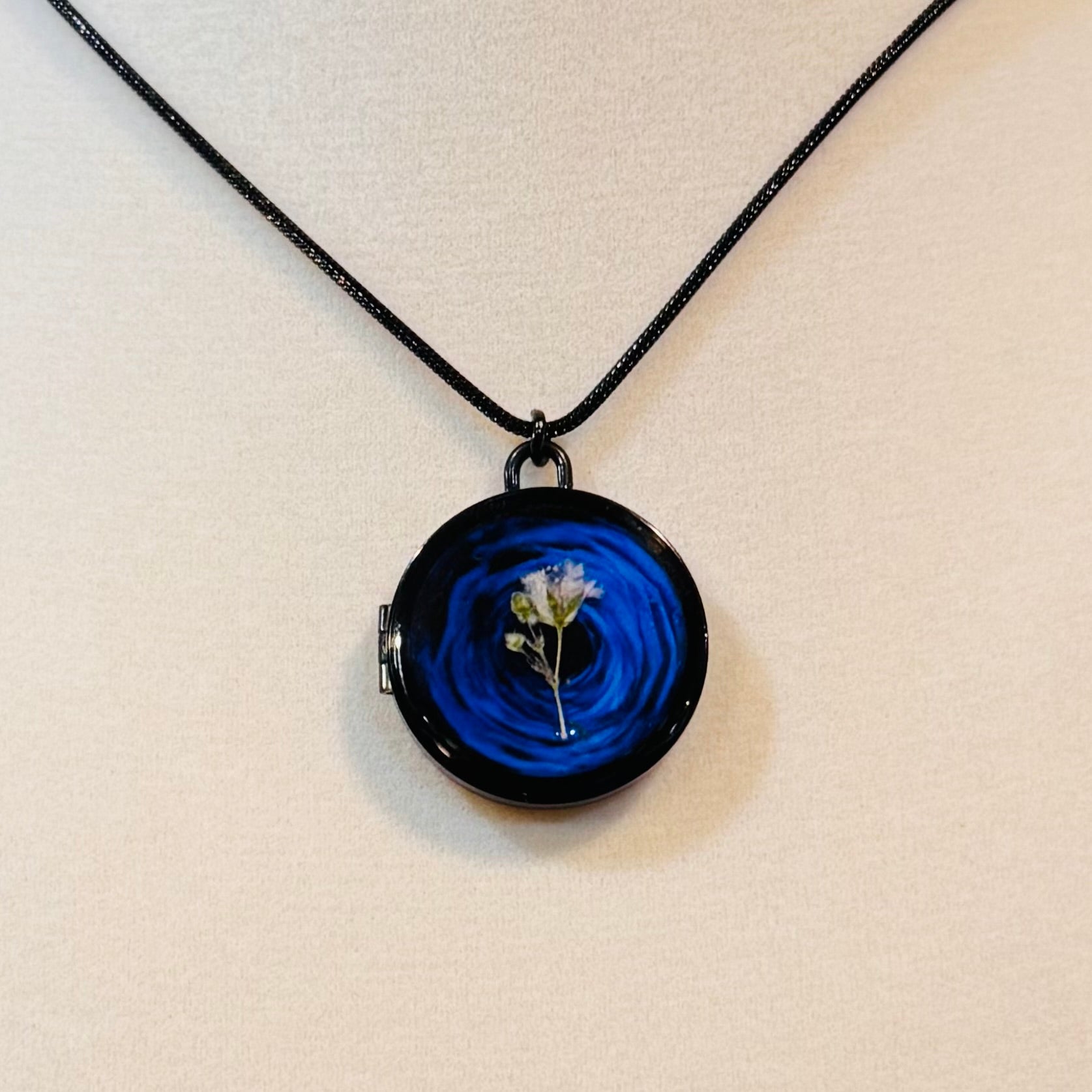 this piece contains real dried flowers , created with love and magic. black circle-shaped locket. please keep in mind that these are all handmade using real flowers. colors and flower size/shape can vary from piece to piece. each piece is unique, no two will be exactly the same, only very very similar 🫶🏽