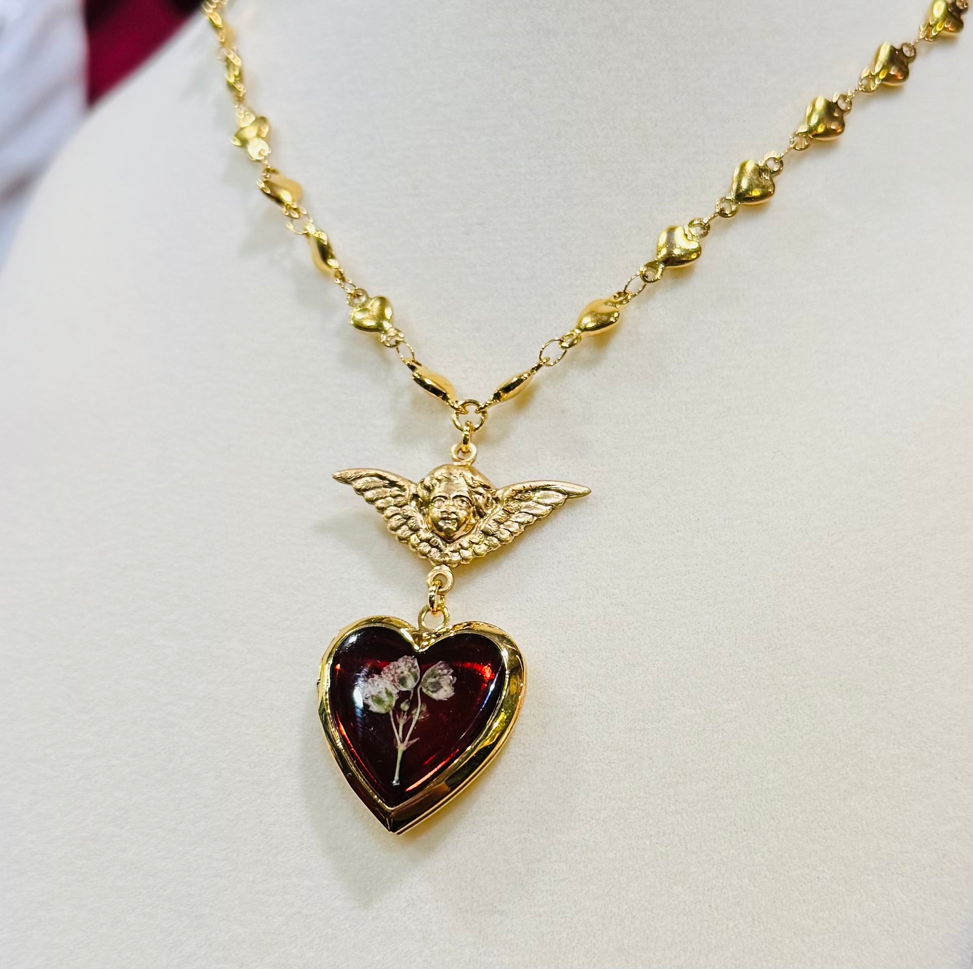 this piece contains real dried flowers , created with love and magic. gold heart-shaped locket. please keep in mind that these are all handmade using real flowers. colors and flower size/shape can vary from piece to piece. each piece is unique, no two will be exactly the same, only very very similar 🫶🏽
