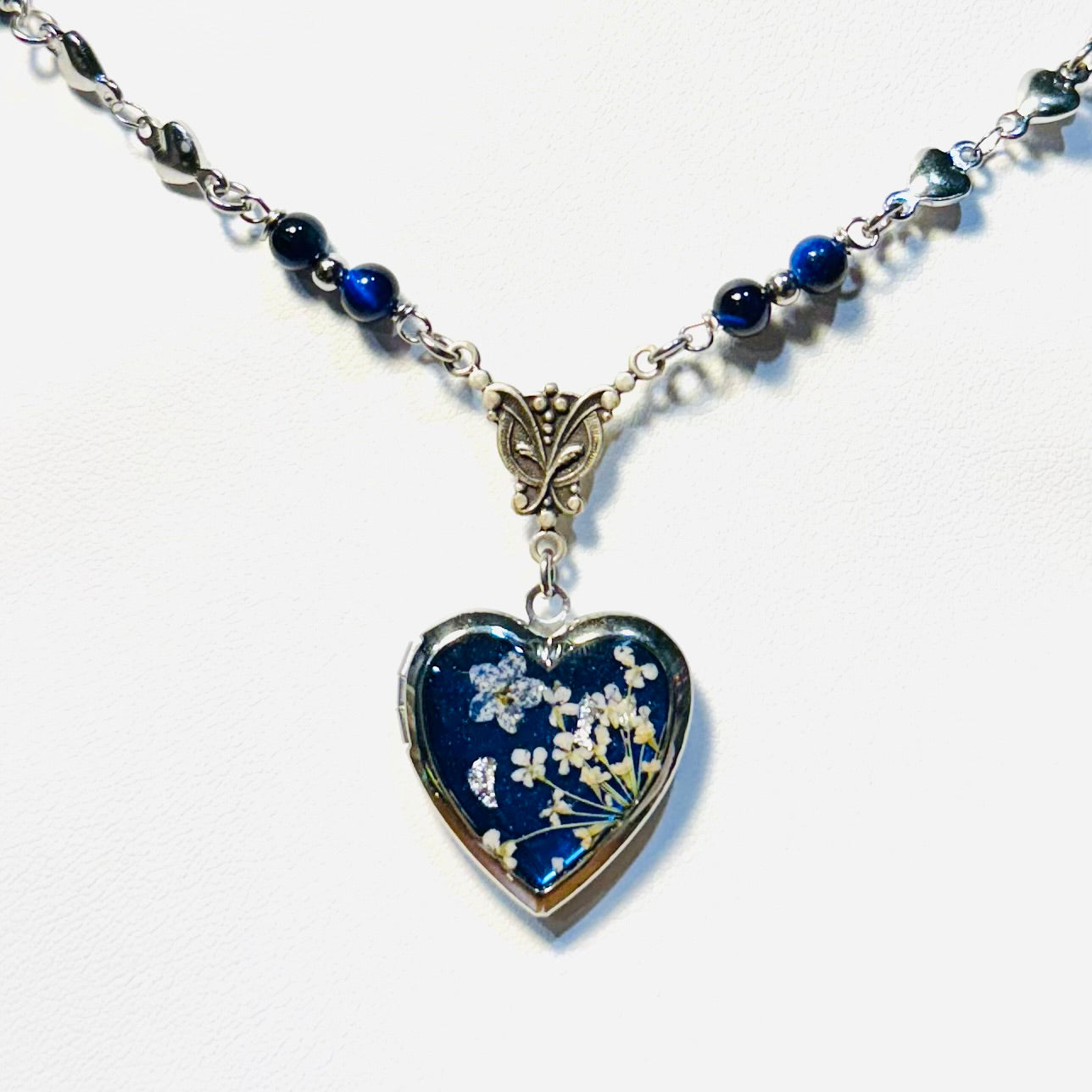 this piece contains real dried flowers , created with love and magic. silver heart-shaped locket.