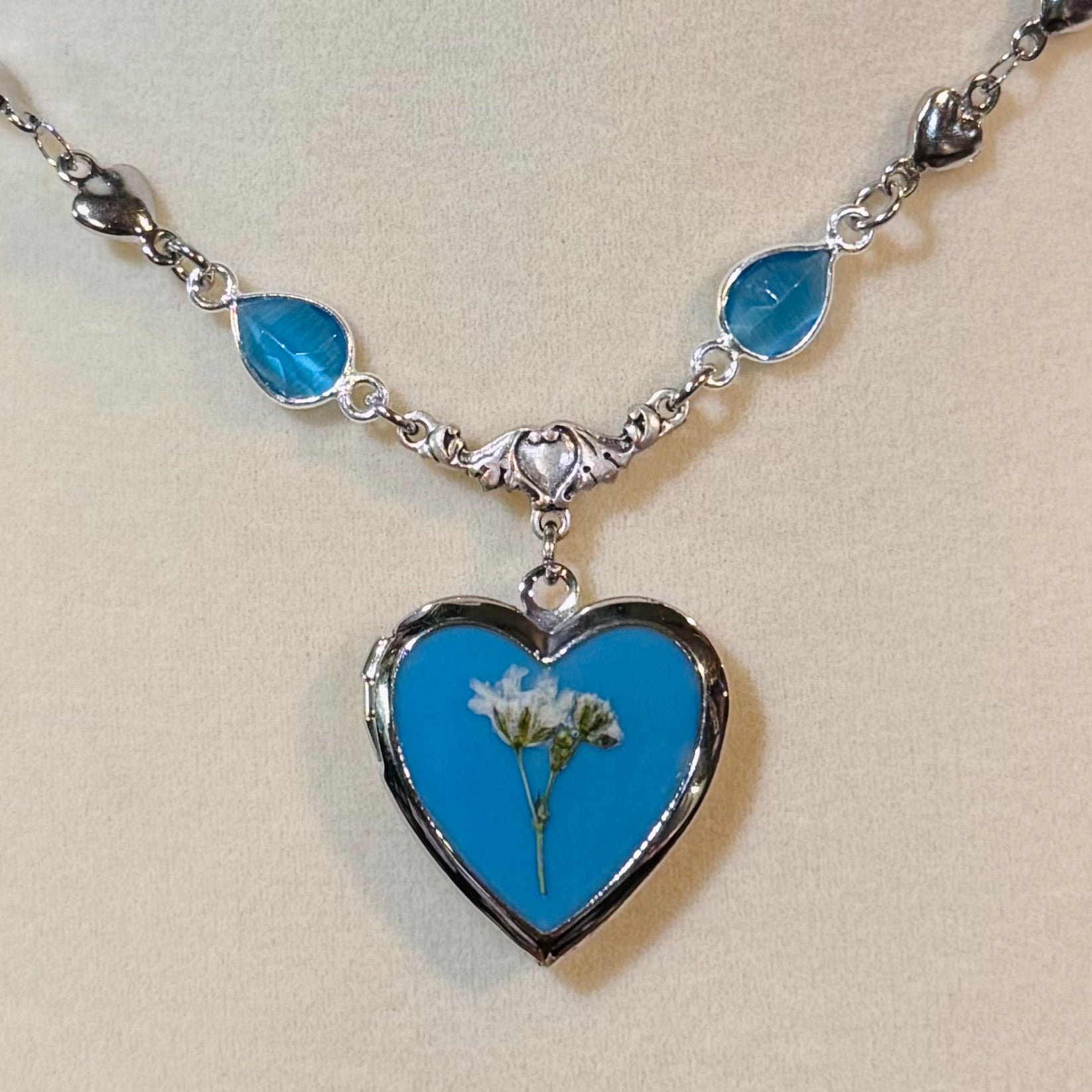 this piece contains real dried flowers , created with love and magic. silver heart-shaped locket. glass charm. please keep in mind that these are all handmade using real flowers. colors and flower size/shape can vary from piece to piece. each piece is unique, no two will be exactly the same, only very very similar 🫶🏽