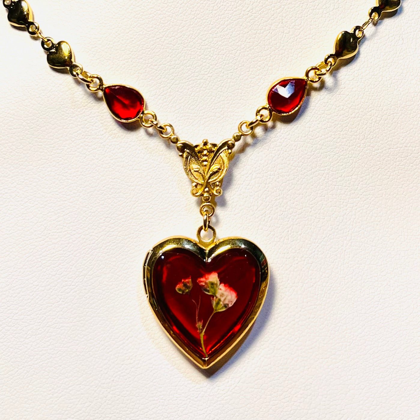 this piece contains real dried flowers , created with love and magic. gold heart-shaped locket with red glass charms.