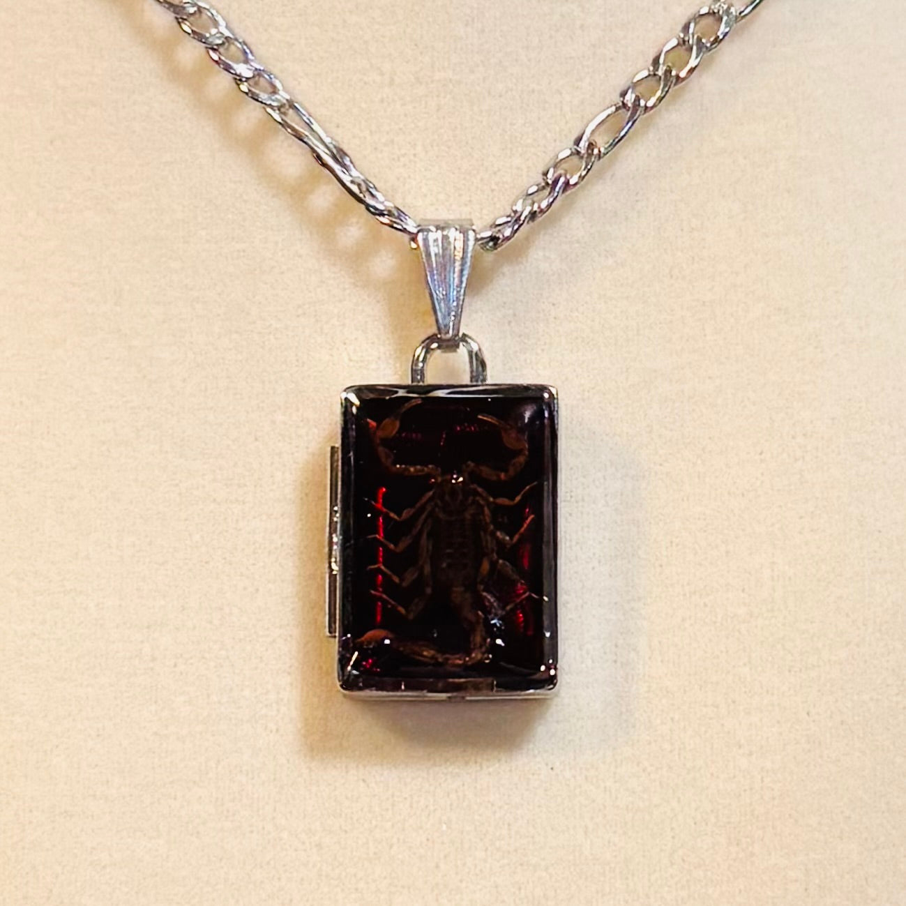 this piece contains real dried flowers , created with love and magic. silver rectangle-shaped locket. real alacran. please keep in mind that these are all handmade using real alácranes colors and size/shape can vary from piece to piece. each piece is unique, no two will be exactly the same, only very very similar 🫶🏽