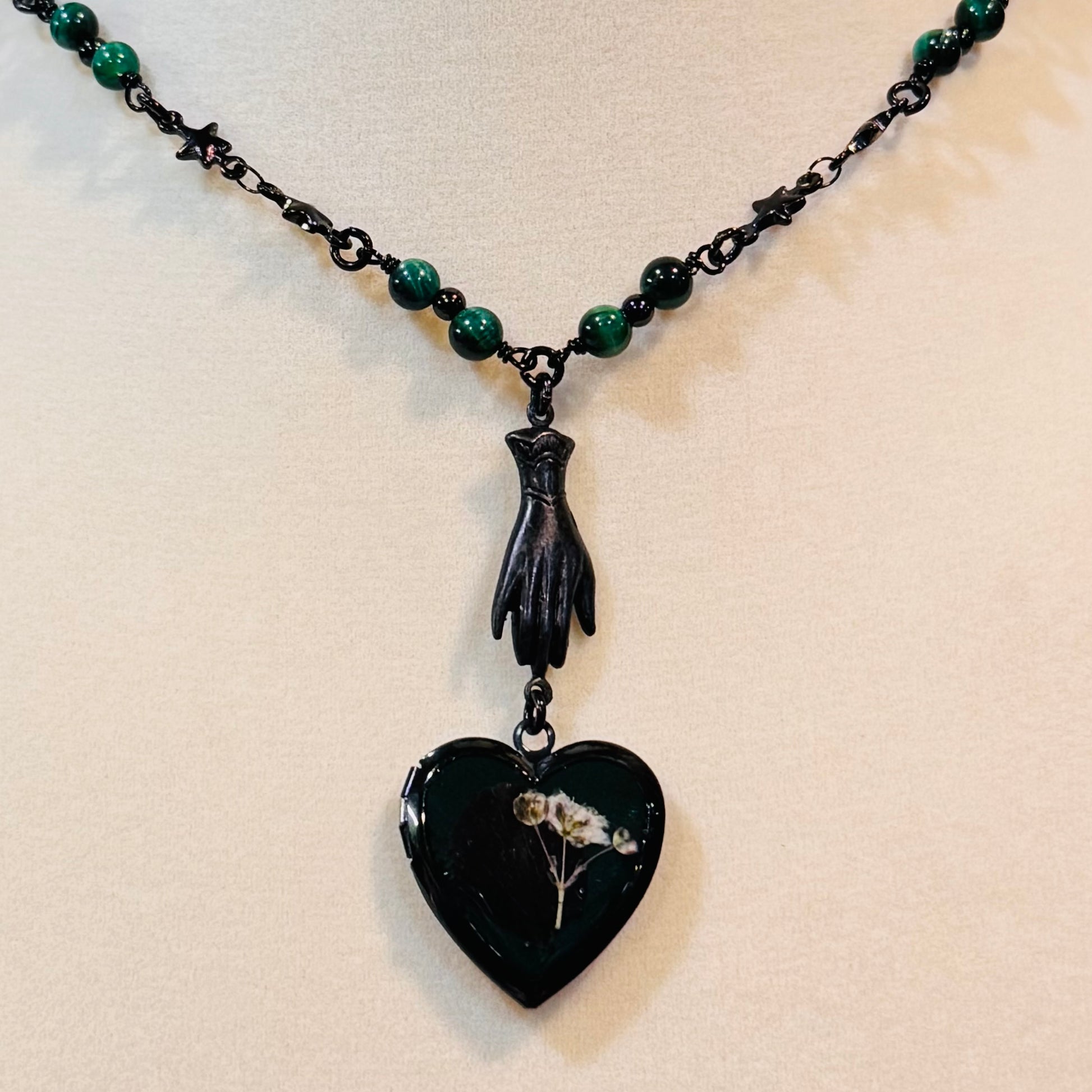 this piece contains real dried flowers , created with love and magic. black heart-shaped locket. genuine crystals. please keep in mind that these are all handmade using real flowers. colors and flower size/shape can vary from piece to piece. each piece is unique, no two will be exactly the same, only very very similar 🫶🏽