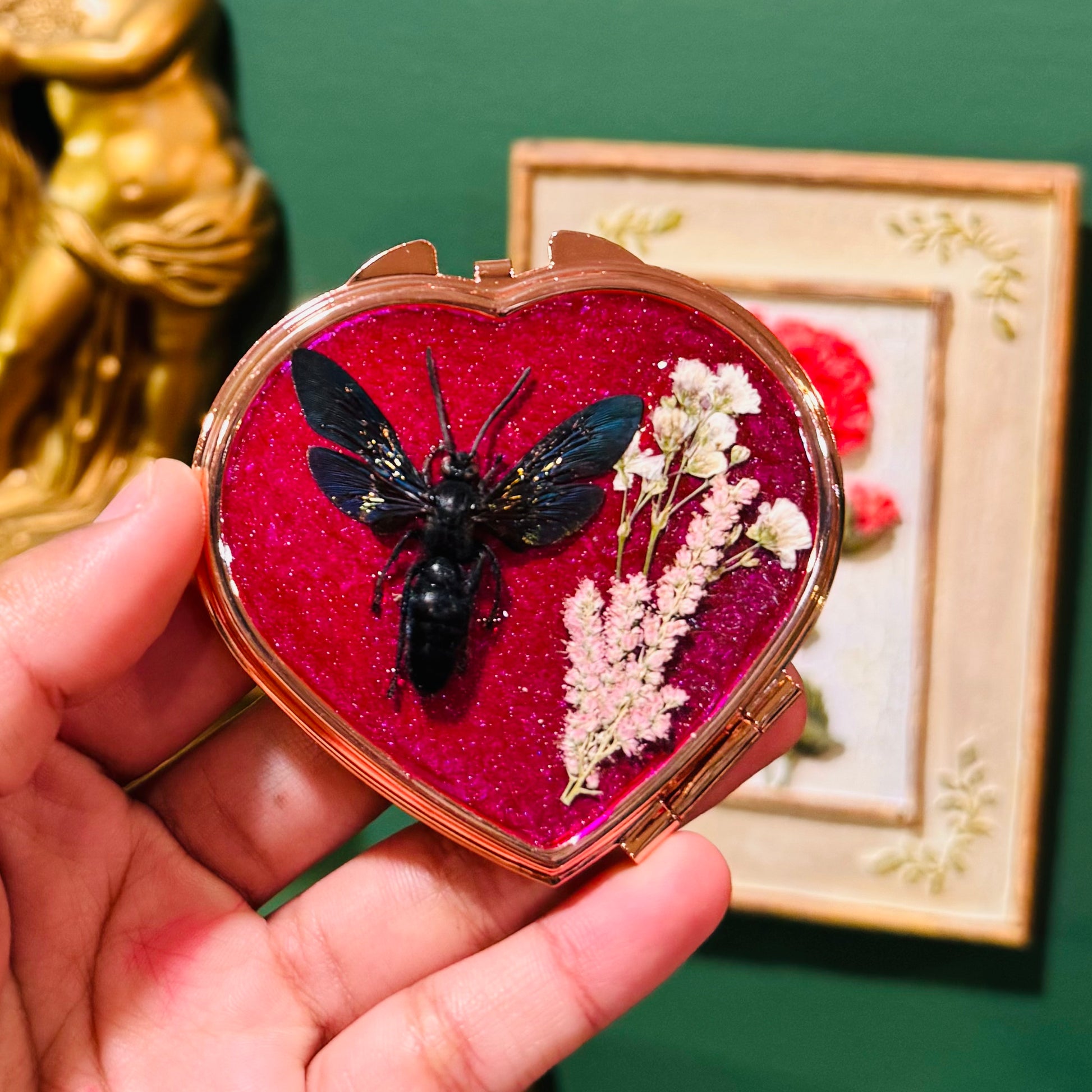 pocket mirror. two sides, one regular one 2x zoom. rose gold, real ethically sourced bug.