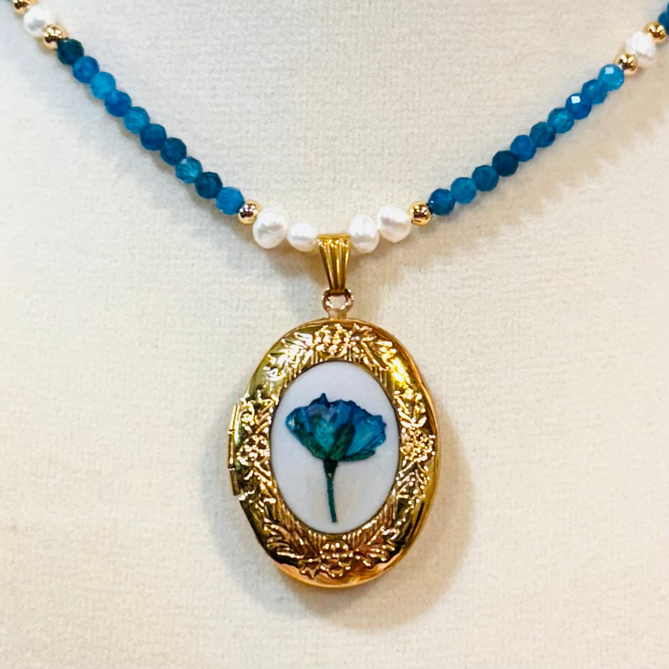 this piece contains real dried flowers , created with love and magic. gold oval-shaped locket. genuine crystals and freshwater pearls. please keep in mind that these are all handmade using real flowers. colors and flower size/shape can vary from piece to piece. each piece is unique, no two will be exactly the same, only very very similar 🫶🏽