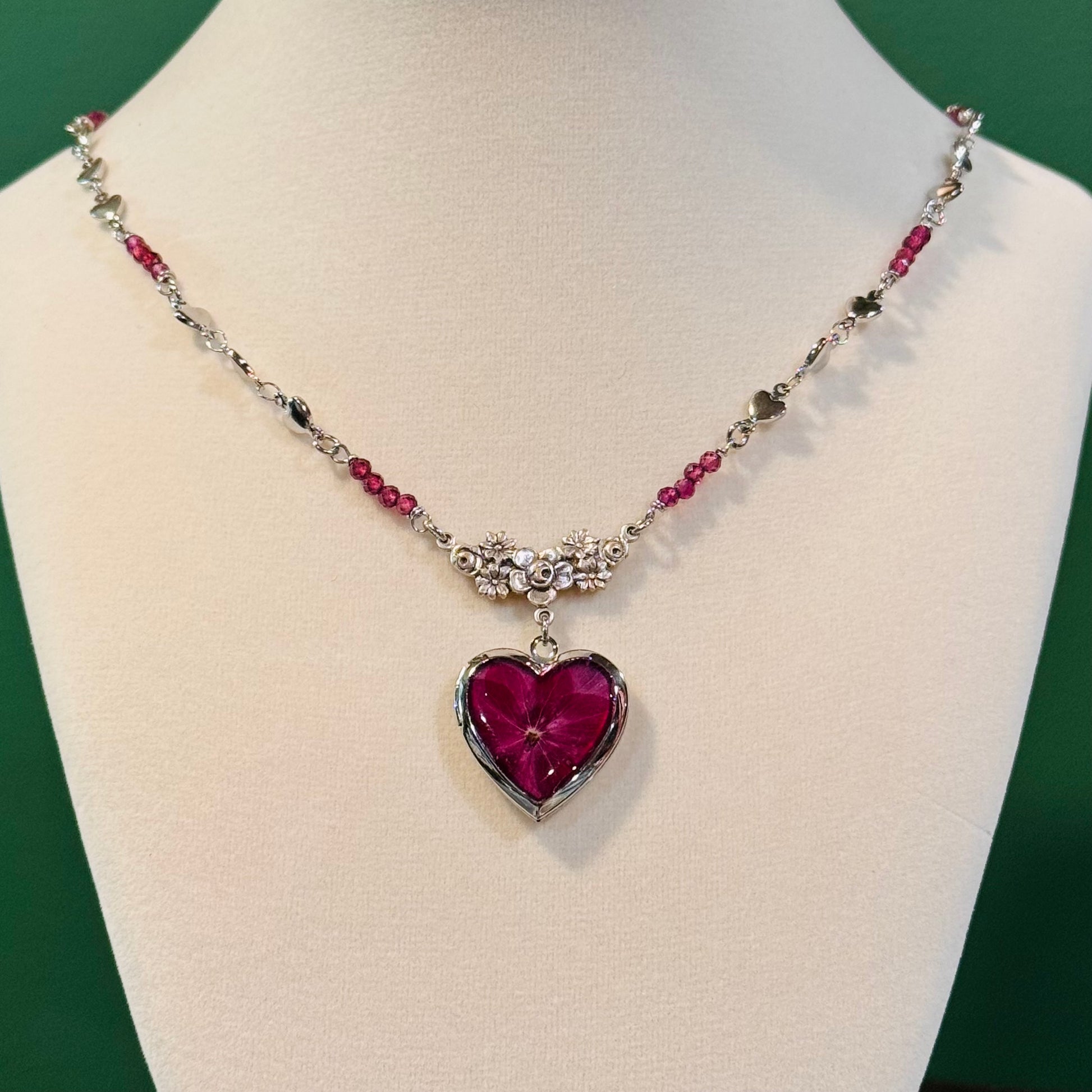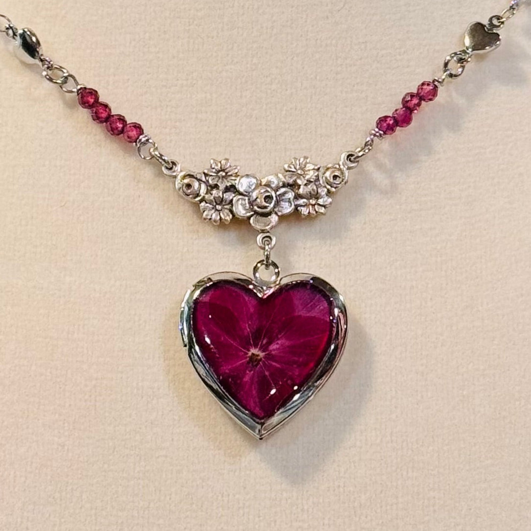 this piece contains real dried flowers , created with love and magic. silver heart-shaped locket. genuine crystal beads. please keep in mind that these are all handmade using real flowers. colors and flower size/shape can vary from piece to piece. each piece is unique, no two will be exactly the same, only very very similar 🫶🏽