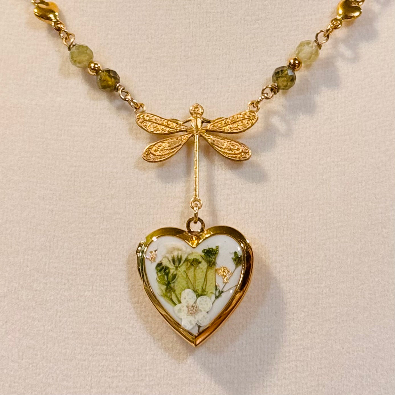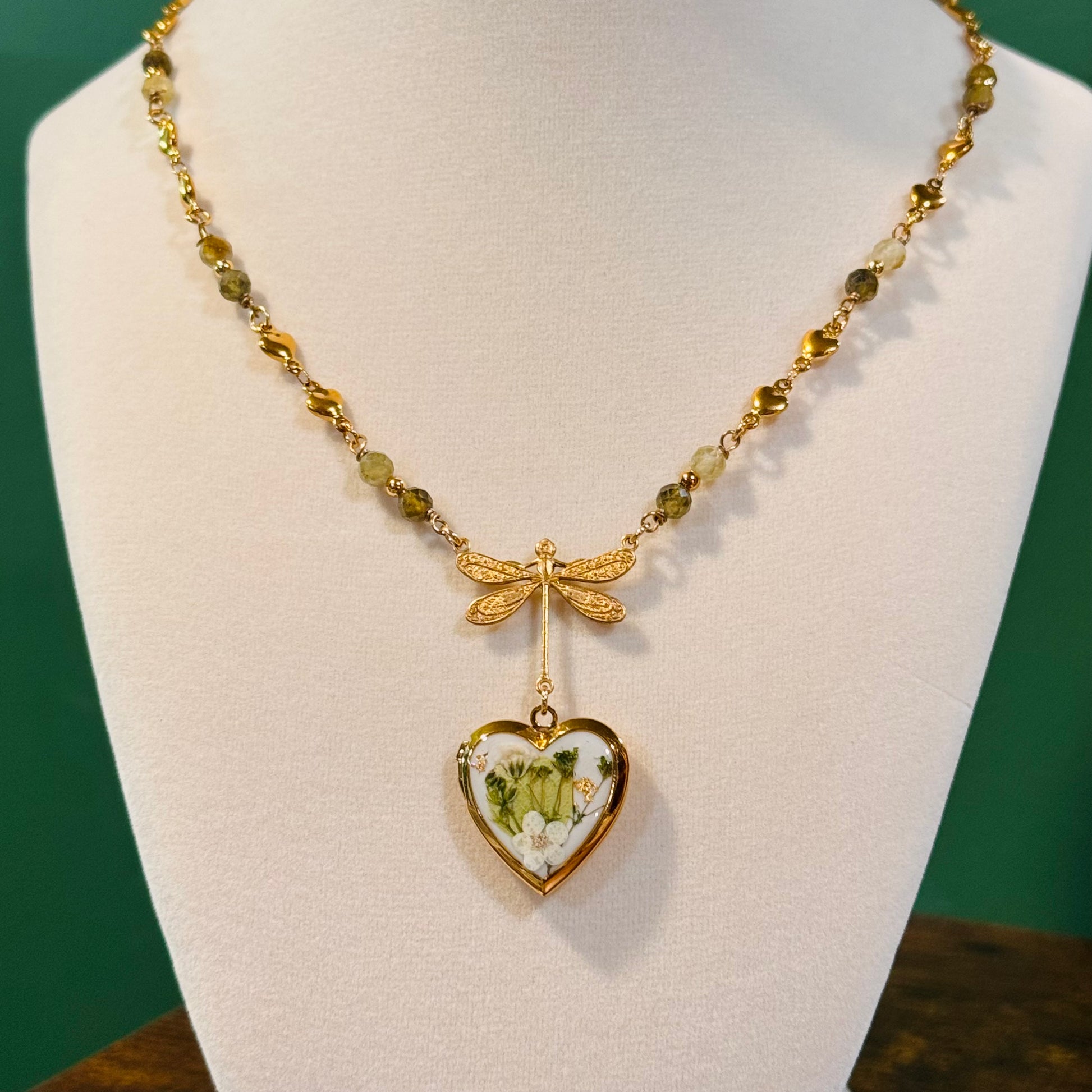 this piece contains real dried flowers , created with love and magic. gold heart-shaped locket. genuine crystal beads. please keep in mind that these are all handmade using real flowers. colors and flower size/shape can vary from piece to piece. each piece is unique, no two will be exactly the same, only very very similar 🫶🏽