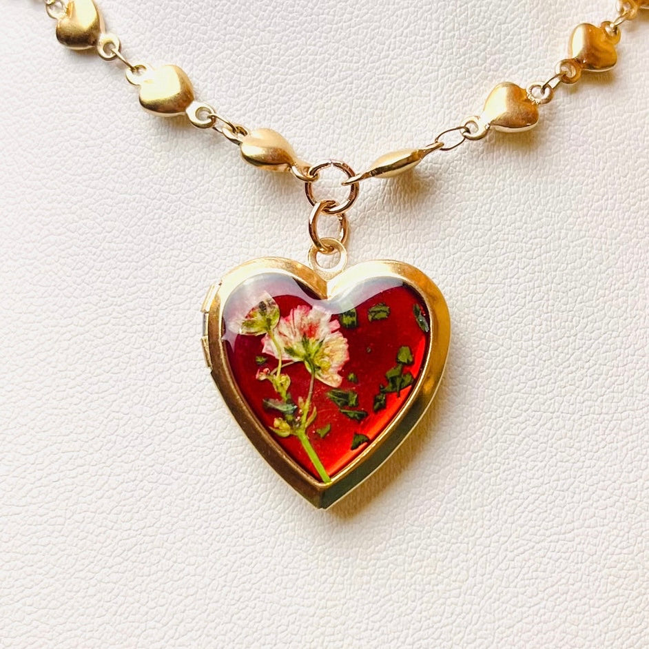 this piece contains real dried flowers , created with love and magic. ROSE gold heart-shaped locket. please keep in mind that these are all handmade using real flowers. colors and flower size/shape can vary from piece to piece. each piece is unique, no two will be exactly the same, only very very similar 🫶🏽