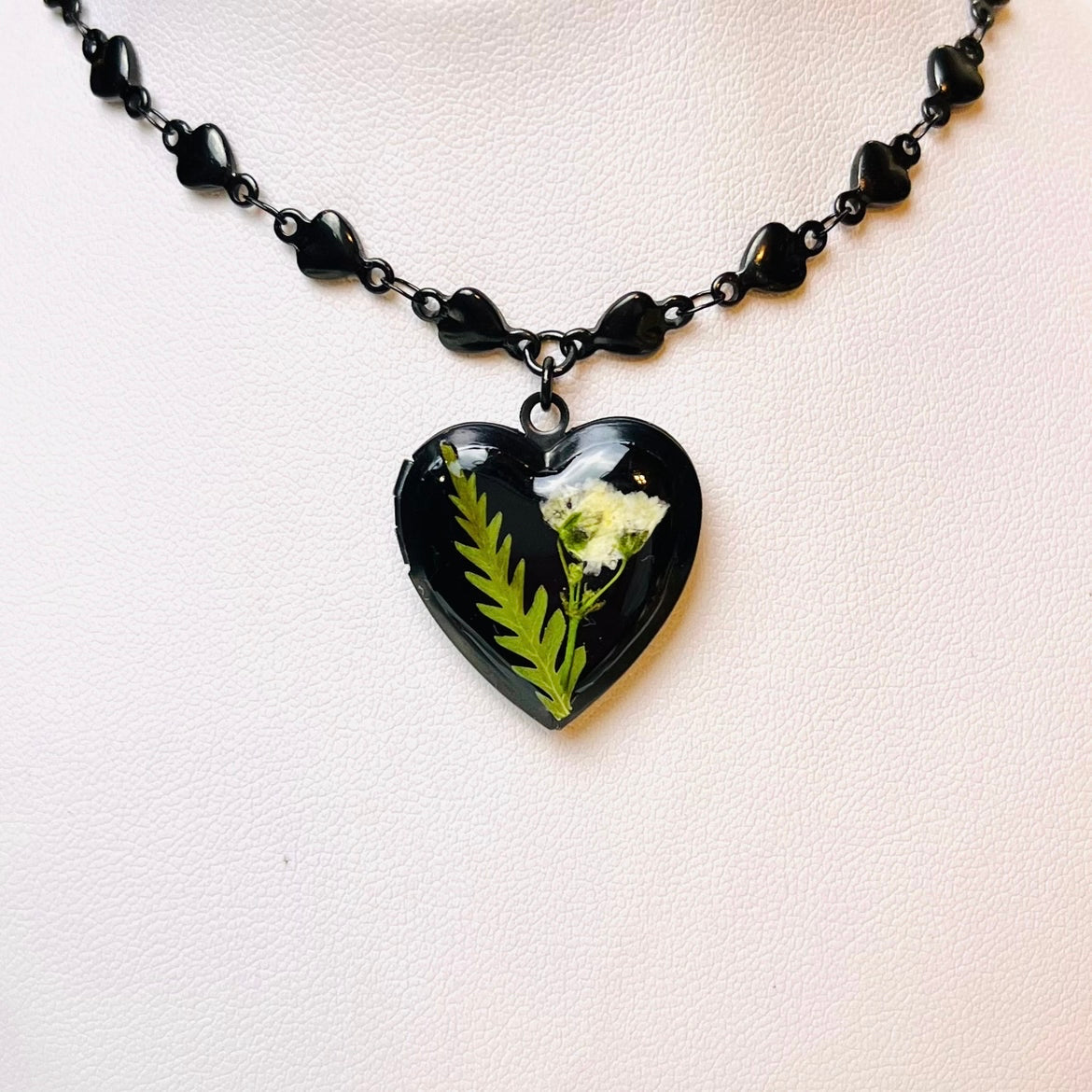 this piece contains real dried flowers , created with love and magic. black heart-shaped locket.