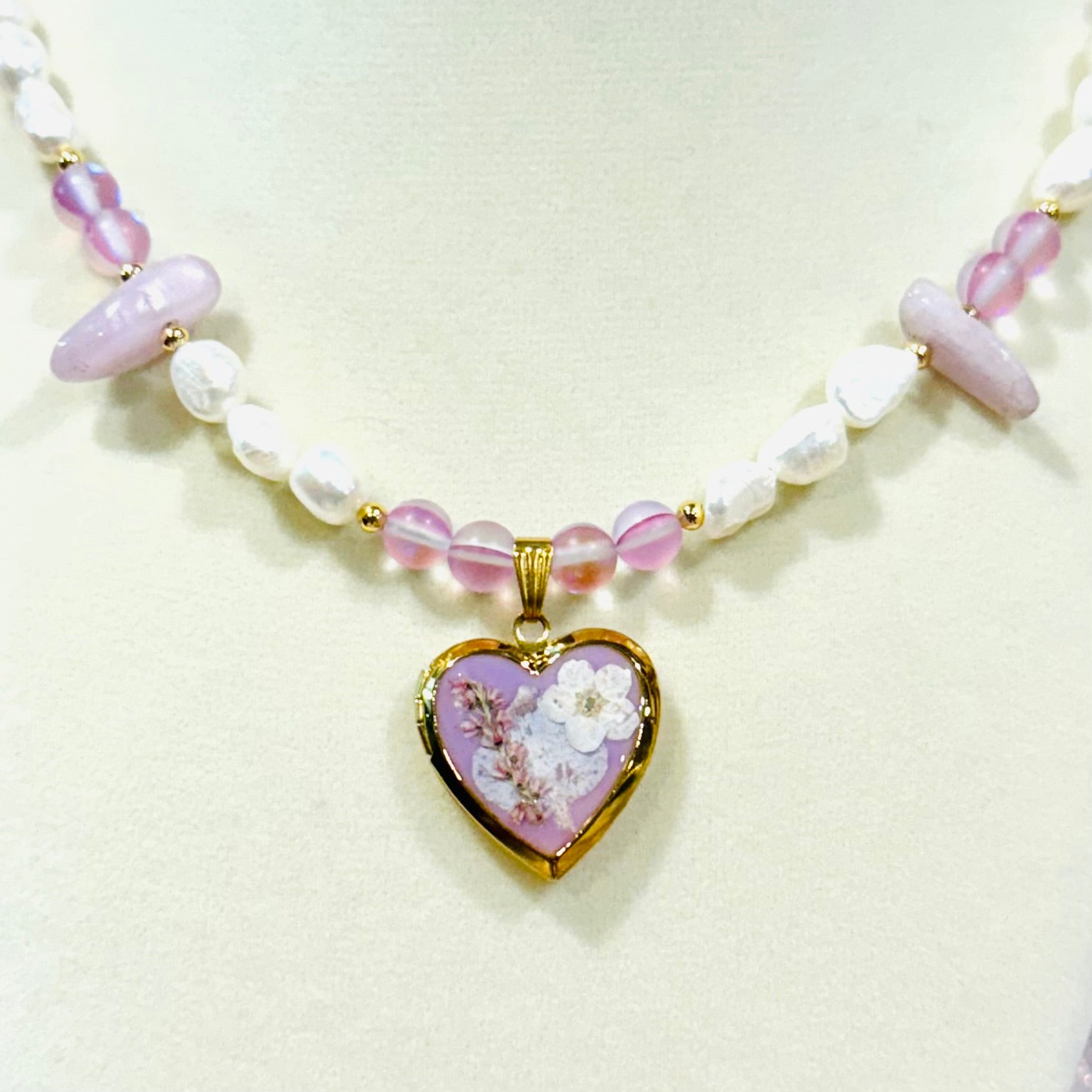 this piece contains real dried flowers , created with love and magic. gold heart-shaped locket. genuine freshwater pearls and pink glass beads. please keep in mind that these are all handmade using real flowers. colors and flower size/shape can vary from piece to piece. each piece is unique, no two will be exactly the same, only very very similar 🫶🏽
