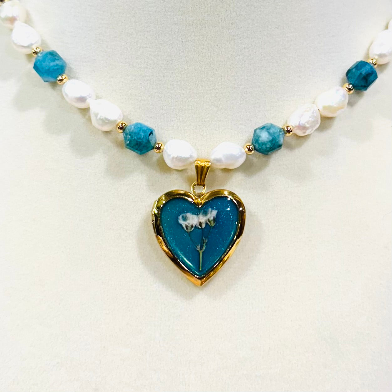 this piece contains real dried flowers , created with love and magic. gold heart-shaped locket. genuine freshwater pearls and crystals. please keep in mind that these are all handmade using real flowers. colors and flower size/shape can vary from piece to piece. each piece is unique, no two will be exactly the same, only very very similar 🫶🏽