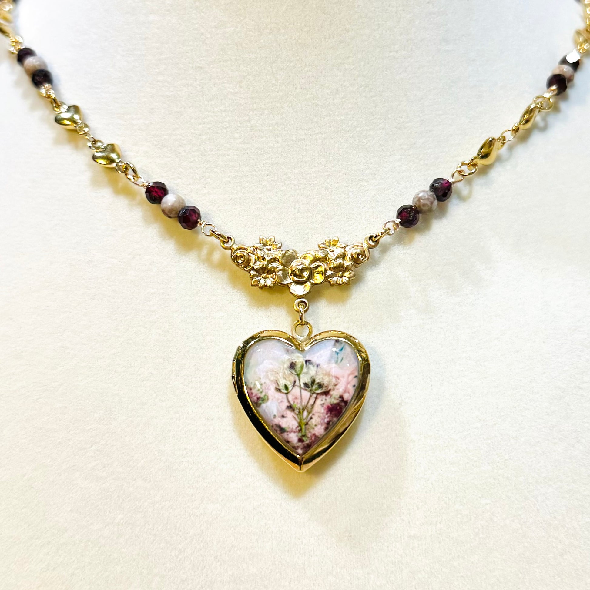 this piece contains real dried flowers , created with love and magic, gold heart-shaped locket.