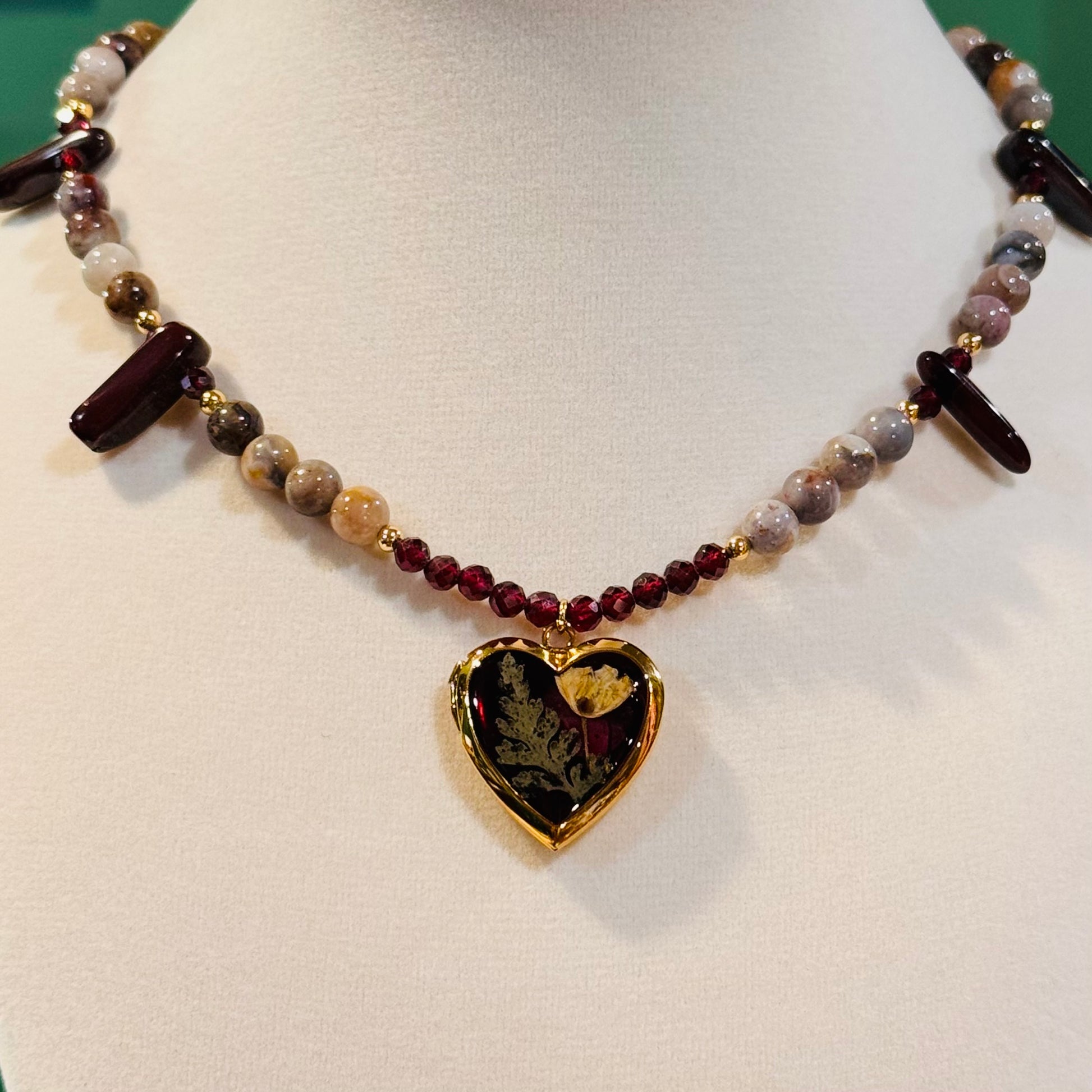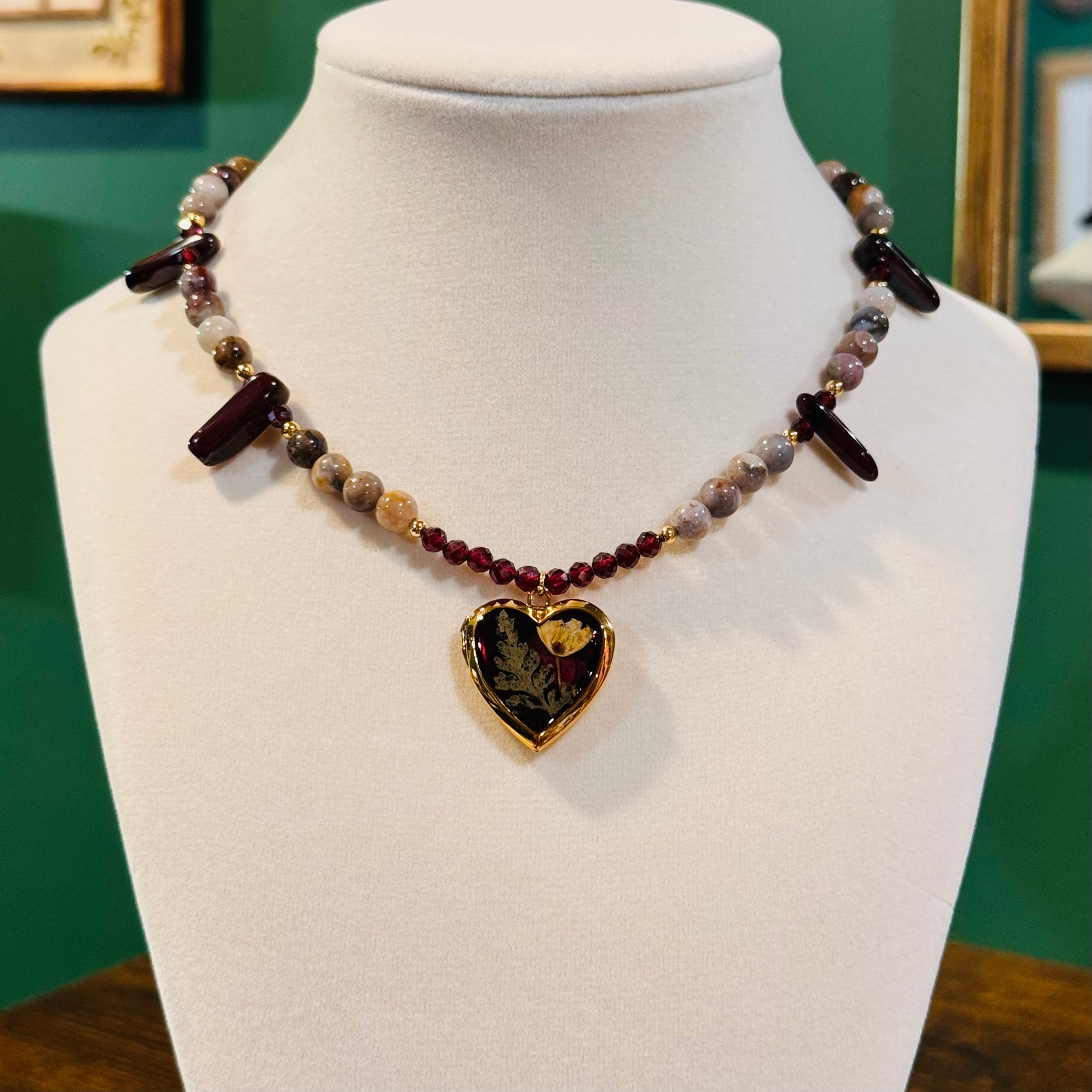 this piece contains real dried flowers , created with love and magic. gold heart-shaped locket. genuine crystal beads. please keep in mind that these are all handmade using real flowers. colors and flower size/shape can vary from piece to piece. each piece is unique, no two will be exactly the same, only very very similar 🫶🏽