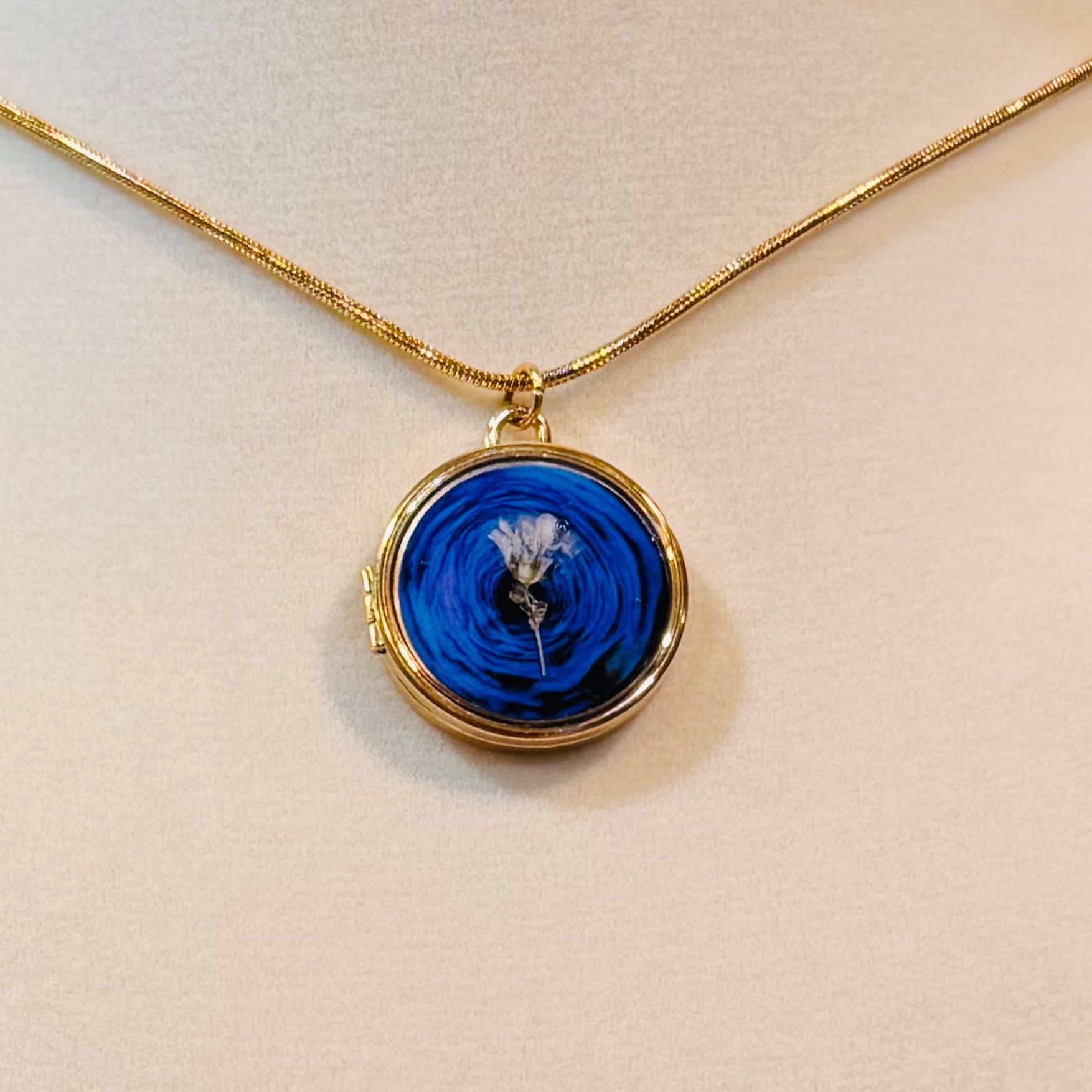 this piece contains real dried flowers , created with love and magic. gold circle-shaped locket. please keep in mind that these are all handmade using real flowers. colors and flower size/shape can vary from piece to piece. each piece is unique, no two will be exactly the same, only very very similar 🫶🏽